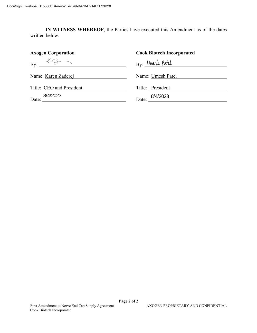 Page 2 of 2 First Amendment to Nerve End Cap Supply Agreement AXOGEN PROPRIETARY AND CONFIDENTIAL Cook Biotech Incorporated IN WITNESS WHEREOF, the Parties have executed this Amendment as of the dates written below. Axogen Corporation Cook Biotech Incorporated By: By: Name: Karen Zaderej Name: Umesh Patel Title: CEO and President Title: President Date: Date: DocuSign Envelope ID: 5388EBA4-452E-4E49-B47B-B914E5F23B28 8/4/20238/4/2023