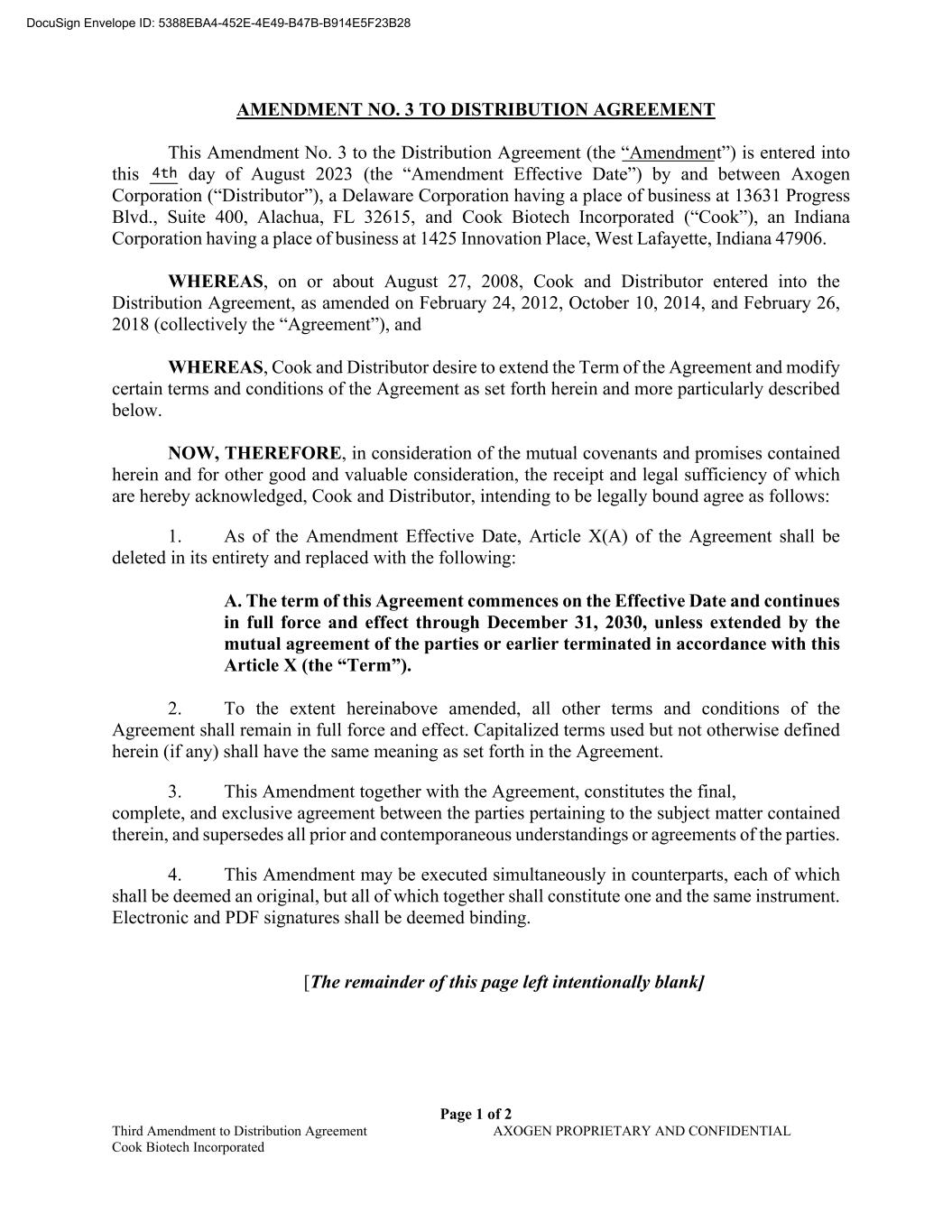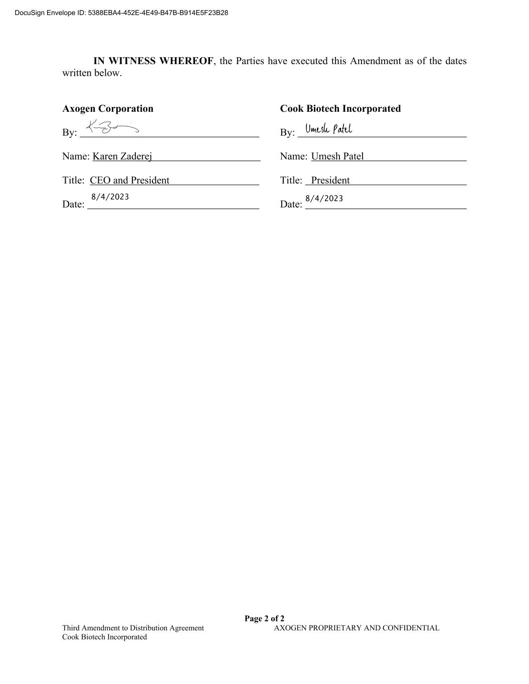 Page 2 of 2 Third Amendment to Distribution Agreement AXOGEN PROPRIETARY AND CONFIDENTIAL Cook Biotech Incorporated IN WITNESS WHEREOF, the Parties have executed this Amendment as of the dates written below. Axogen Corporation Cook Biotech Incorporated By: By: Name: Karen Zaderej Name: Umesh Patel Title: CEO and President Title: President Date: Date: DocuSign Envelope ID: 5388EBA4-452E-4E49-B47B-B914E5F23B28 8/4/20238/4/2023