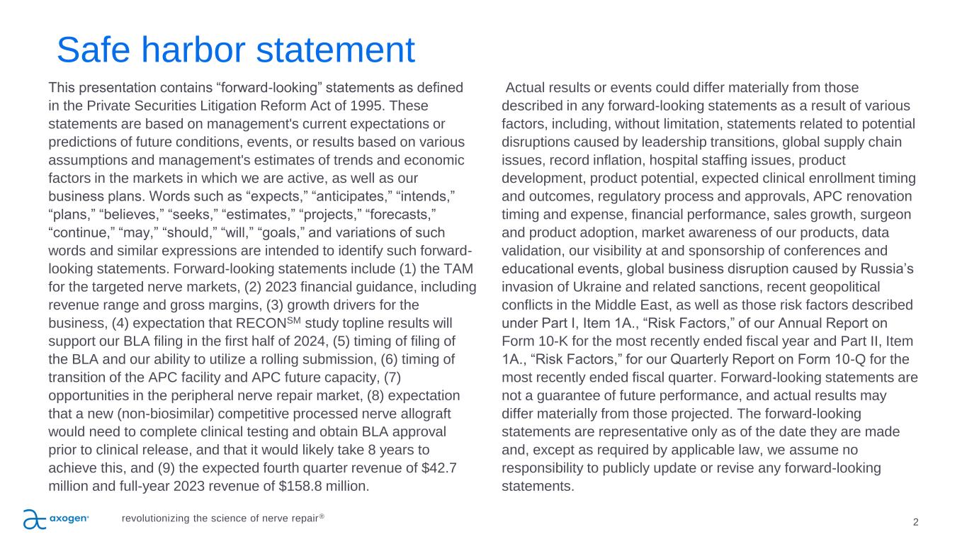 2 This presentation contains “forward-looking” statements as defined in the Private Securities Litigation Reform Act of 1995. These statements are based on management's current expectations or predictions of future conditions, events, or results based on various assumptions and management's estimates of trends and economic factors in the markets in which we are active, as well as our business plans. Words such as “expects,” “anticipates,” “intends,” “plans,” “believes,” “seeks,” “estimates,” “projects,” “forecasts,” “continue,” “may,” “should,” “will,” “goals,” and variations of such words and similar expressions are intended to identify such forward- looking statements. Forward-looking statements include (1) the TAM for the targeted nerve markets, (2) 2023 financial guidance, including revenue range and gross margins, (3) growth drivers for the business, (4) expectation that RECONSM study topline results will support our BLA filing in the first half of 2024, (5) timing of filing of the BLA and our ability to utilize a rolling submission, (6) timing of transition of the APC facility and APC future capacity, (7) opportunities in the peripheral nerve repair market, (8) expectation that a new (non-biosimilar) competitive processed nerve allograft would need to complete clinical testing and obtain BLA approval prior to clinical release, and that it would likely take 8 years to achieve this, and (9) the expected fourth quarter revenue of $42.7 million and full-year 2023 revenue of $158.8 million. Actual results or events could differ materially from those described in any forward-looking statements as a result of various factors, including, without limitation, statements related to potential disruptions caused by leadership transitions, global supply chain issues, record inflation, hospital staffing issues, product development, product potential, expected clinical enrollment timing and outcomes, regulatory process and approvals, APC renovation timing and expense, financial performance, sales growth, surgeon and product adoption, market awareness of our products, data validation, our visibility at and sponsorship of conferences and educational events, global business disruption caused by Russia’s invasion of Ukraine and related sanctions, recent geopolitical conflicts in the Middle East, as well as those risk factors described under Part I, Item 1A., “Risk Factors,” of our Annual Report on Form 10-K for the most recently ended fiscal year and Part II, Item 1A., “Risk Factors,” for our Quarterly Report on Form 10-Q for the most recently ended fiscal quarter. Forward-looking statements are not a guarantee of future performance, and actual results may differ materially from those projected. The forward-looking statements are representative only as of the date they are made and, except as required by applicable law, we assume no responsibility to publicly update or revise any forward-looking statements. Safe harbor statement revolutionizing the science of nerve repair®