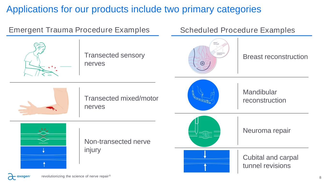 7 P IL L A R 5 Opportunities in nerve repair P IL L A R 4 P IL L A R 3 Pain Iatrogenic injuries, post-traumatic, migraine, TKA and TKH pain, amputations, symptomatic neuromas, and nerve compressions Core business anchored in Trauma and Upper Extremity, and expanded to Breast, OMF and Pain. Further Market Expansion in Corneal Neurotization and Podiatry. revolutionizing the science of nerve repair® Breast Neurotization Autologous Flap Reconstruction; Breast Implant Reconstruction Urology Prostatectomy OMF Mandible Tumor Reconstruction; Iatrogenic Nerve Injuries, Extremities (Trauma and Compression) Acute trauma, revision carpal tunnel and cubital tunnel Head & Neck OB/GYN General Surgery Cardio Thoracic Orthopedic Podiatry Vascular Corneal Neurotization