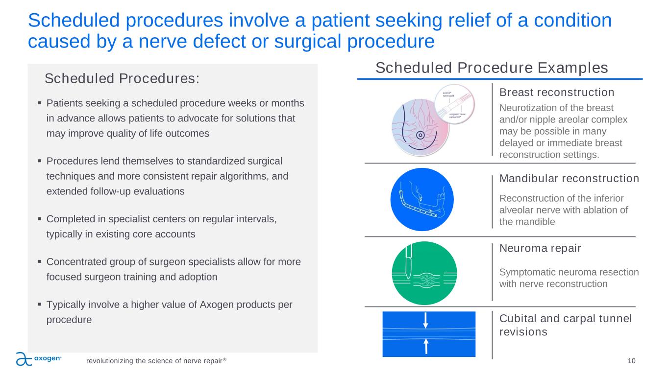 Emergent trauma cases generally result from injuries that initially present in an ER revolutionizing the science of nerve repair® 9 ▪ Significant number of nerve injuries typically referred to and completed by a specialist either immediately or within a few days following the injury with limited post op follow-up evaluations ▪ Emergent and diverse nature of injuries result in variable patient pathways from ER to nerve repair specialist and diverse repair algorithms ▪ Specialist surgeons typically perform nerve repair as a minor portion of their overall practice ▪ Opportunity to drive care pathways with surgeon education supported by clinical and economic data ▪ Opportunity to shift site of care for routine traumatic injuries to more cost-efficient settings (ASC) Emergent Procedures: Emergent Trauma Procedure Examples Transected sensory nerves Transected mixed/motor nerves Non-transected nerve injury Digital nerve injury after sharp lacerations e.g., a knife slipping when cutting an avocado, glass injuries More complex trauma injuries e.g., circular saw injury to hand and wrist resulting in ulnar and median nerve damage Trauma induced compression and stretch injuries e.g., peroneal nerve compression at the fibular head after knee dislocation, shoulder trauma causing stretching of the brachial plexus