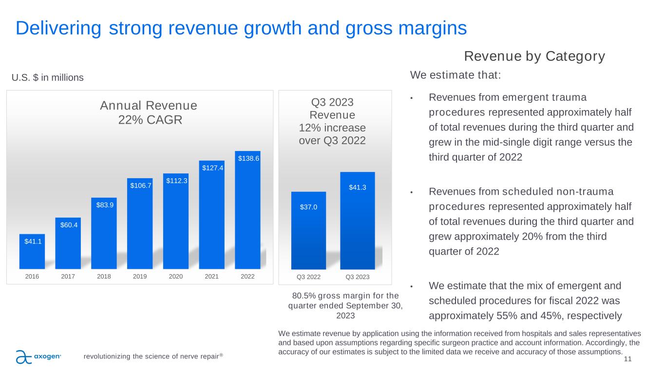 Scheduled procedures involve a patient seeking relief of a condition caused by a nerve defect or surgical procedure revolutionizing the science of nerve repair® 10 ▪ Patients seeking a scheduled procedure weeks or months in advance allows patients to advocate for solutions that may improve quality of life outcomes ▪ Procedures lend themselves to standardized surgical techniques and more consistent repair algorithms, and extended follow-up evaluations ▪ Completed in specialist centers on regular intervals, typically in existing core accounts ▪ Concentrated group of surgeon specialists allow for more focused surgeon training and adoption ▪ Typically involve a higher value of Axogen products per procedure Scheduled Procedures: Scheduled Procedure Examples Breast reconstruction Mandibular reconstruction Neuroma repair Cubital and carpal tunnel revisions Neurotization of the breast and/or nipple areolar complex may be possible in many delayed or immediate breast reconstruction settings. Reconstruction of the inferior alveolar nerve with ablation of the mandible Symptomatic neuroma resection with nerve reconstruction