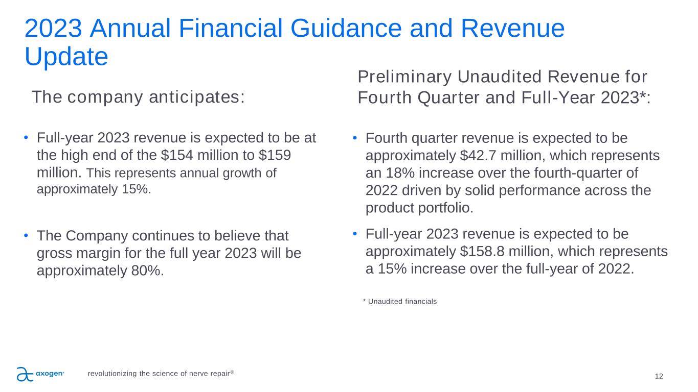 11 Delivering strong revenue growth and gross margins Revenue by Category 80.5% gross margin for the quarter ended September 30, 2023 U.S. $ in millions revolutionizing the science of nerve repair® $41.1 $60.4 $83.9 $106.7 $112.3 $127.4 $138.6 2016 2017 2018 2019 2020 2021 2022 Annual Revenue 22% CAGR We estimate that: • Revenues from emergent trauma procedures represented approximately half of total revenues during the third quarter and grew in the mid-single digit range versus the third quarter of 2022 • Revenues from scheduled non-trauma procedures represented approximately half of total revenues during the third quarter and grew approximately 20% from the third quarter of 2022 • We estimate that the mix of emergent and scheduled procedures for fiscal 2022 was approximately 55% and 45%, respectively We estimate revenue by application using the information received from hospitals and sales representatives and based upon assumptions regarding specific surgeon practice and account information. Accordingly, the accuracy of our estimates is subject to the limited data we receive and accuracy of those assumptions. $37.0 $41.3 Q3 2022 Q3 2023 Q3 2023 Revenue 12% increase over Q3 2022