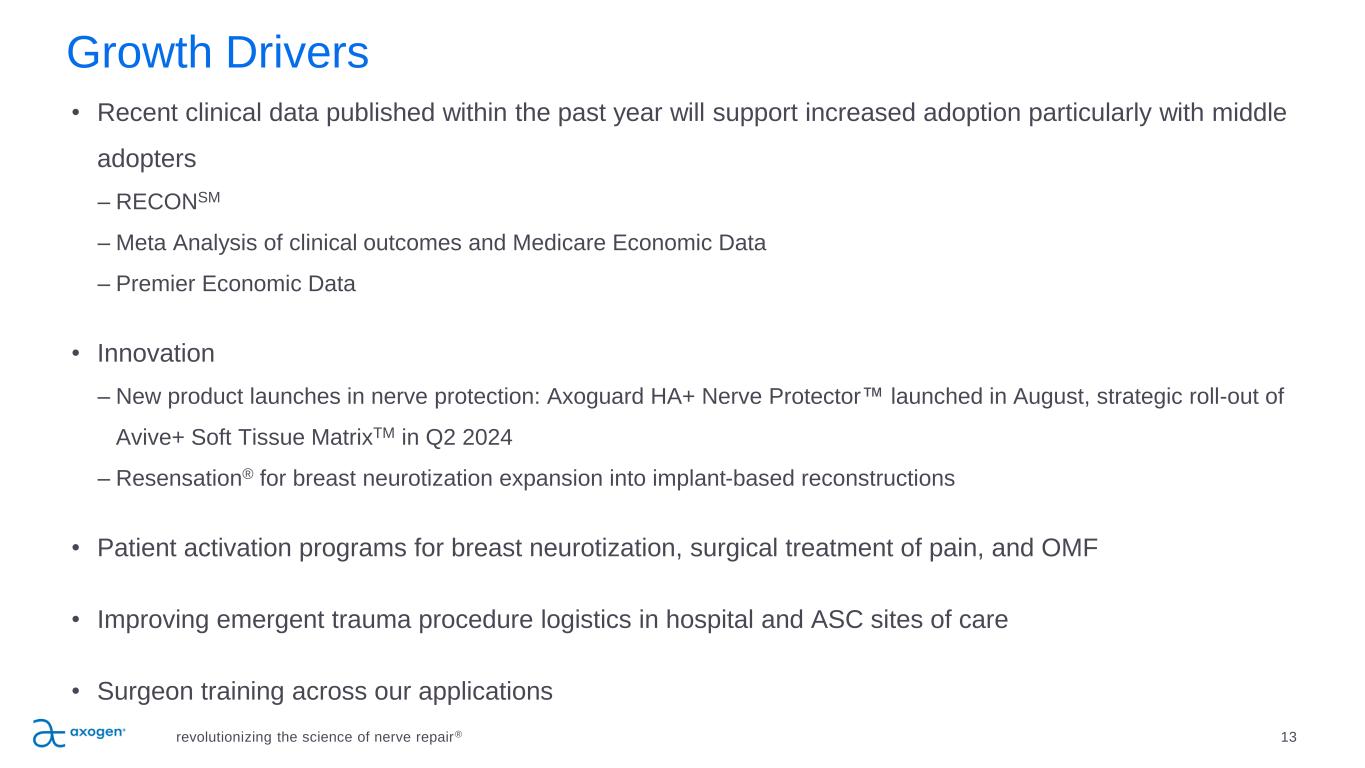 2023 Annual Financial Guidance and Revenue Update 12 • Full-year 2023 revenue is expected to be at the high end of the $154 million to $159 million. This represents annual growth of approximately 15%. revolutionizing the science of nerve repair® • The Company continues to believe that gross margin for the full year 2023 will be approximately 80%. The company anticipates: • Fourth quarter revenue is expected to be approximately $42.7 million, which represents an 18% increase over the fourth-quarter of 2022 driven by solid performance across the product portfolio. • Full-year 2023 revenue is expected to be approximately $158.8 million, which represents a 15% increase over the full-year of 2022. Preliminary Unaudited Revenue for Fourth Quarter and Full-Year 2023*: * Unaudited financials