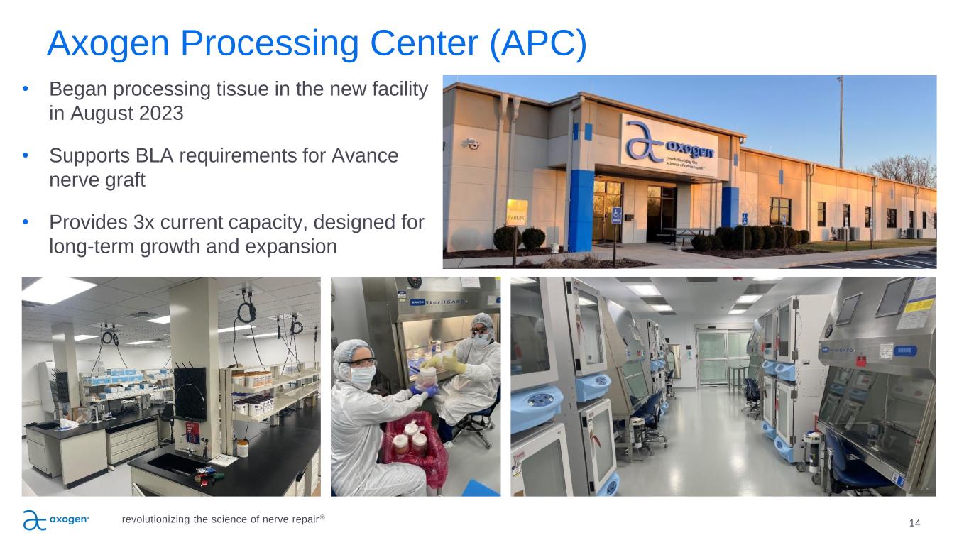 Growth Drivers revolutionizing the science of nerve repair® 13 • Recent clinical data published within the past year will support increased adoption particularly with middle adopters – RECONSM – Meta Analysis of clinical outcomes and Medicare Economic Data – Premier Economic Data • Innovation – New product launches in nerve protection: Axoguard HA+ Nerve Protector™ launched in August, strategic roll-out of Avive+ Soft Tissue MatrixTM in Q2 2024 – Resensation® for breast neurotization expansion into implant-based reconstructions • Patient activation programs for breast neurotization, surgical treatment of pain, and OMF • Improving emergent trauma procedure logistics in hospital and ASC sites of care • Surgeon training across our applications