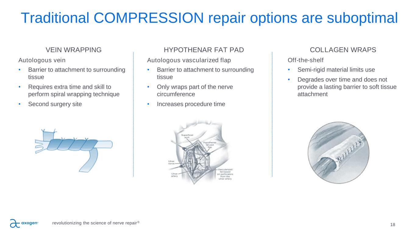Traditional TRANSECTION repair options are suboptimal 16 SUTURE Direct suture repair of no-gap injuries • Common repair method • May result in tension to the repair leading to ischemia • Concentrates sutures at the coaptation site AUTOGRAFT Traditional method despite several disadvantages • Secondary surgery • Loss of function and sensation at harvest site • 27% complication rate including infection, wound healing and chronic pain 19 • Limited availability of graft length and diameter SYNTHETIC CONDUITS Convenient off the shelf option; limited efficacy & use • Provides only gross direction for regrowth • Limited to small gaps • 34%-57% failure rate >5mm gaps20, 21 • Semi-rigid and opaque material limits use and visualization • Repair reliant on fibrin clot formation revolutionizing the science of nerve repair®
