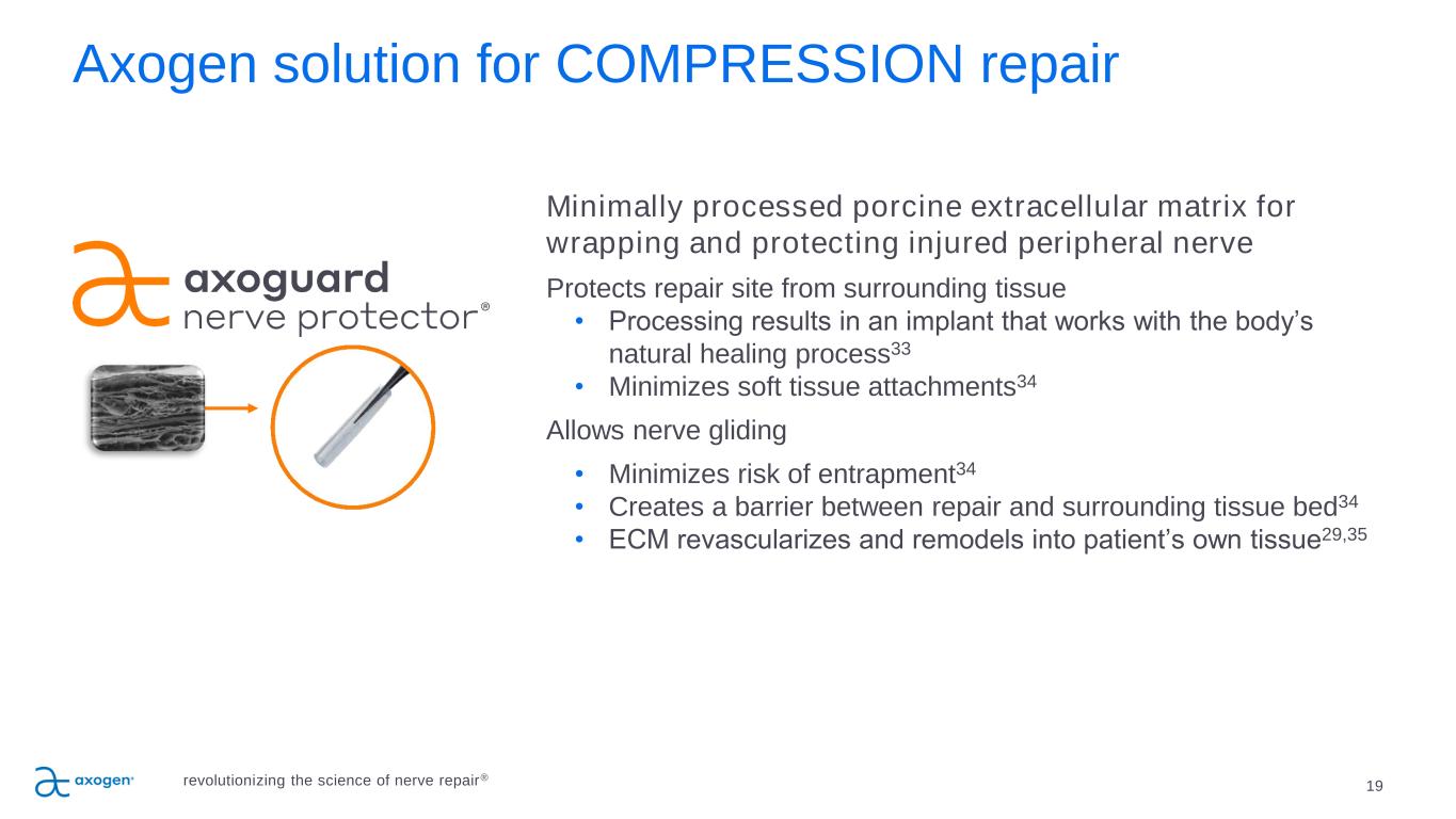 Traditional COMPRESSION repair options are suboptimal 18 VEIN WRAPPING Autologous vein • Barrier to attachment to surrounding tissue • Requires extra time and skill to perform spiral wrapping technique • Second surgery site HYPOTHENAR FAT PAD Autologous vascularized flap • Barrier to attachment to surrounding tissue • Only wraps part of the nerve circumference • Increases procedure time COLLAGEN WRAPS Off-the-shelf • Semi-rigid material limits use • Degrades over time and does not provide a lasting barrier to soft tissue attachment revolutionizing the science of nerve repair®