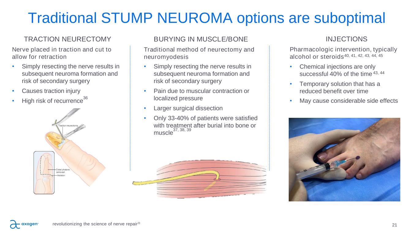 Traditional STUMP NEUROMA options are suboptimal 21 TRACTION NEURECTOMY Nerve placed in traction and cut to allow for retraction • Simply resecting the nerve results in subsequent neuroma formation and risk of secondary surgery • Causes traction injury • High risk of recurrence 36 BURYING IN MUSCLE/BONE Traditional method of neurectomy and neuromyodesis • Simply resecting the nerve results in subsequent neuroma formation and risk of secondary surgery • Pain due to muscular contraction or localized pressure • Larger surgical dissection • Only 33-40% of patients were satisfied with treatment after burial into bone or muscle 37, 38, 39 INJECTIONS Pharmacologic intervention, typically alcohol or steroids40, 41, 42, 43, 44, 45 • Chemical injections are only successful 40% of the time 43, 44 • Temporary solution that has a reduced benefit over time • May cause considerable side effects revolutionizing the science of nerve repair®