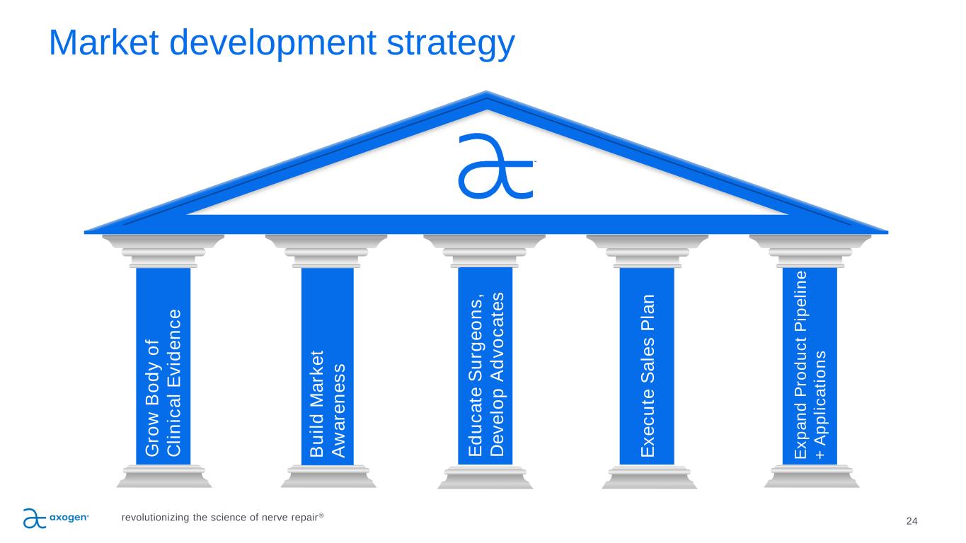 23 Avance Patents and Regulatory Landscape Avance nerve graft is processed and distributed in accordance with US FDA requirements for Human Cellular and Tissue-based Products (HCT/P) Issued U.S. Patents (additional patents pending) Axogen has Enforcement Discretion from FDA allowing continued sales under controls applicable to HCT/Ps with agreed transition plan to regulation as a Biological Product under a Biologic License Application (BLA) if approved. Axogen expects to file the BLA in the first half of 2024 A new (non-biosimilar) competitive processed nerve allograft, we believe, would need to complete clinical testing and obtain BLA approval prior to clinical release, and it would likely require at least 8 years to achieve this. Avance expected to be the reference product for the category of processed nerve allograft Avance nerve graft Axogen’s nerve graft-related IP New (non-biosimilar) competitive BLA product estimated 8 years Protection from biosimilars using Avance as the reference application –at least 12 years from Avance BLA approval 7,732,200 7,402,319 7,851,447 8,758,794 9,597,429 9,572,911 9,690,975 9,996,729 10,311,281 10,783,349 11,156,595 11,513,039 11,523,606 revolutionizing the science of nerve repair®