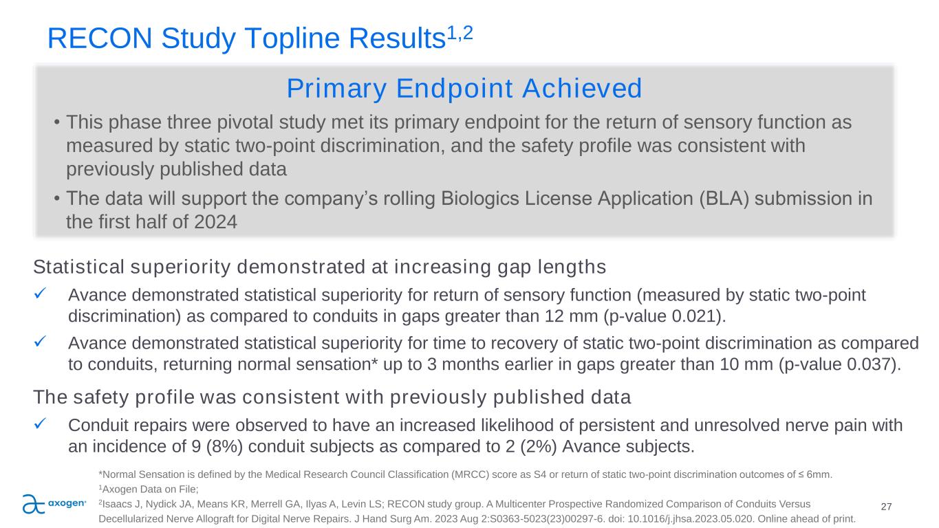 RECON : A Multicenter, Prospective, Randomized, Subject & Evaluator Blinded Comparative Study of Nerve Cuffs & Avance Nerve Graft Evaluating Recovery Outcomes for the Repair of Nerve Discontinuities 26 Safety & efficacy non- inferiority comparison of Avance vs conduit Evaluated upper extremity digital nerve repair for nerve gaps 5-25mm 220 subjects from up to 25 U.S. centers stratified into gap lengths with two-thirds in the 5-14mm group and one- third in the 15-25mm group revolutionizing the science of nerve repair® SM
