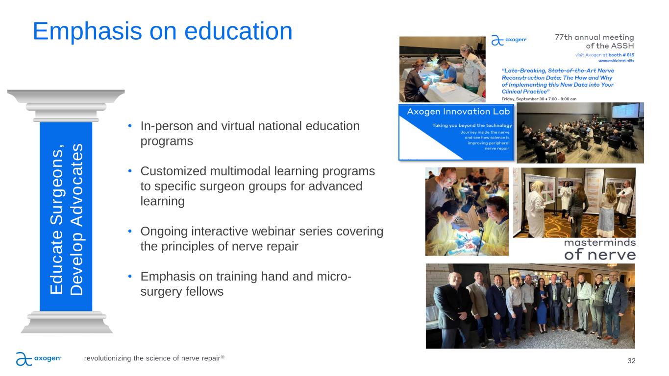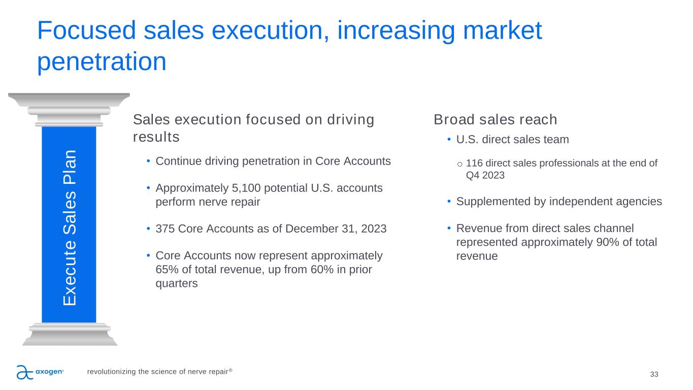 32 P IL L A R 2 Emphasis on education • In-person and virtual national education programs • Customized multimodal learning programs to specific surgeon groups for advanced learning • Ongoing interactive webinar series covering the principles of nerve repair • Emphasis on training hand and micro- surgery fellows E d u c a te S u rg e o n s , D e v e lo p A d v o c a te s revolutionizing the science of nerve repair®