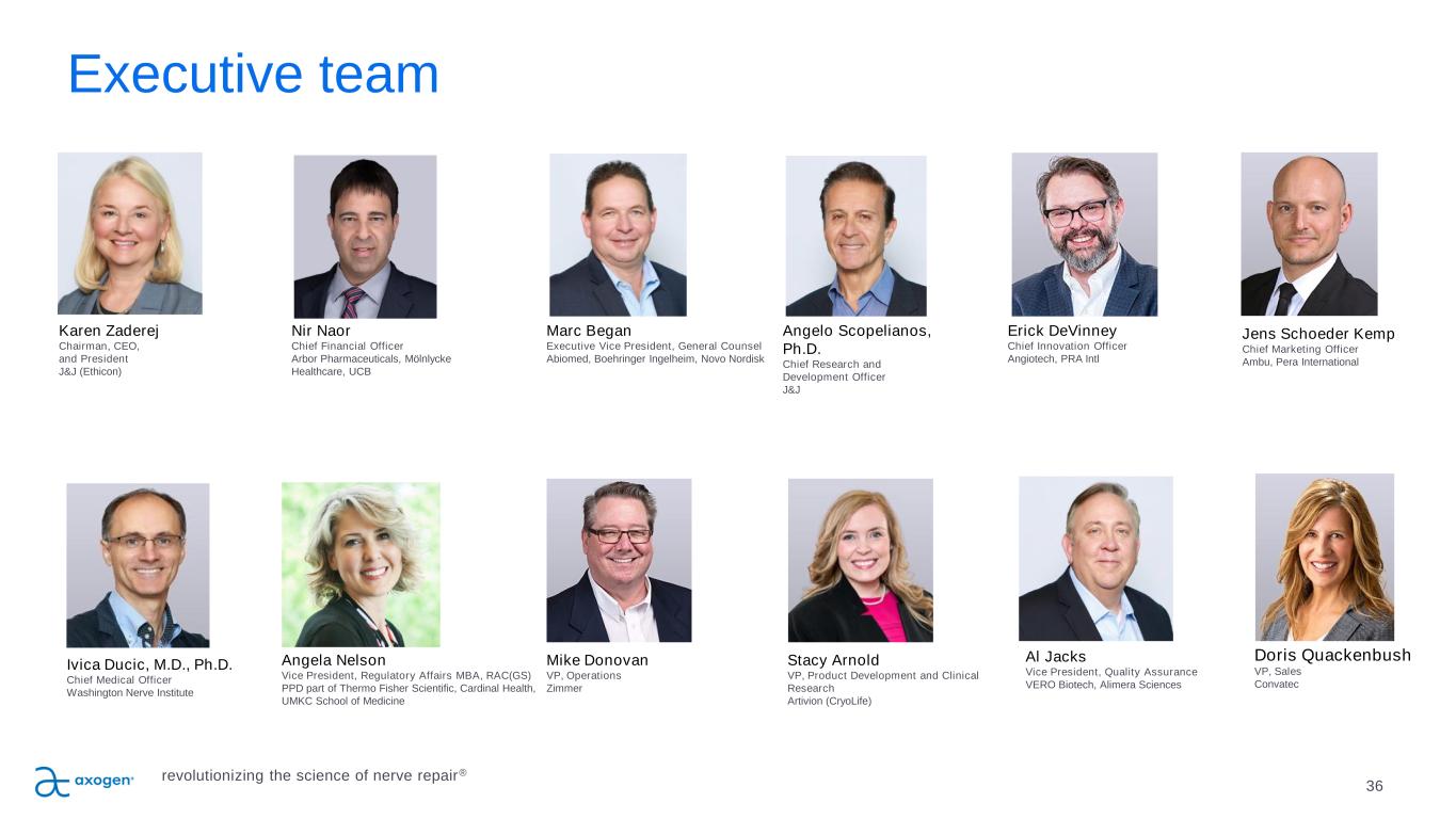 Executive team 36 Doris Quackenbush VP, Sales Convatec revolutionizing the science of nerve repair® Erick DeVinney Chief Innovation Officer Angiotech, PRA Intl Mike Donovan VP, Operations Zimmer Ivica Ducic, M.D., Ph.D. Chief Medical Officer Washington Nerve Institute Jens Schoeder Kemp Chief Marketing Officer Ambu, Pera International Marc Began Executive Vice President, General Counsel Abiomed, Boehringer Ingelheim, Novo Nordisk Angelo Scopelianos, Ph.D. Chief Research and Development Officer J&J Karen Zaderej Chairman, CEO, and President J&J (Ethicon) Nir Naor Chief Financial Officer Arbor Pharmaceuticals, Mölnlycke Healthcare, UCB Stacy Arnold VP, Product Development and Clinical Research Artivion (CryoLife) Angela Nelson Vice President, Regulatory Affairs MBA, RAC(GS) PPD part of Thermo Fisher Scientific, Cardinal Health, UMKC School of Medicine Al Jacks Vice President, Quality Assurance VERO Biotech, Alimera Sciences