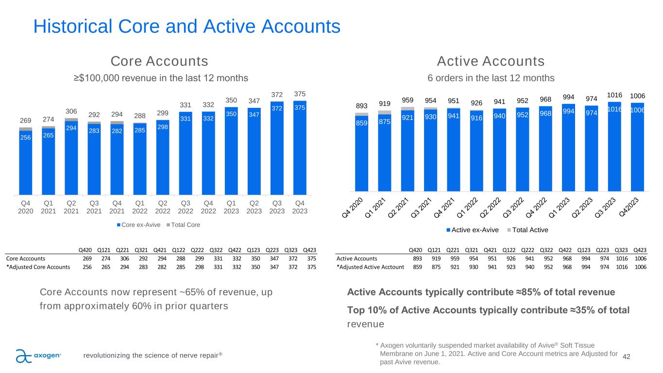 Historical Core and Active Accounts 42revolutionizing the science of nerve repair® * Axogen voluntarily suspended market availability of Avive® Soft Tissue Membrane on June 1, 2021. Active and Core Account metrics are Adjusted for past Avive revenue. Core Accounts now represent ~65% of revenue, up from approximately 60% in prior quarters Core Accounts ≥$100,000 revenue in the last 12 months Active Accounts typically contribute ≈85% of total revenue Top 10% of Active Accounts typically contribute ≈35% of total revenue Active Accounts 6 orders in the last 12 months Q420 Q121 Q221 Q321 Q421 Q122 Q222 Q322 Q422 Q123 Q223 Q323 Q423 Active Accounts 893 919 959 954 951 926 941 952 968 994 974 1016 1006 *Adjusted Active Acctounts 859 875 921 930 941 923 940 952 968 994 974 1016 1006 Q420 Q121 Q221 Q321 Q421 Q122 Q222 Q322 Q422 Q123 Q223 Q323 Q423 Core Acccounts 269 274 306 292 294 288 299 331 332 350 347 372 375 *Adjusted Core Accounts 256 265 294 283 282 285 298 331 332 350 347 372 375 256 265 294 283 282 285 298 331 332 350 347 372 375 269 274 306 292 294 288 299 331 332 350 347 372 375 Q4 2020 Q1 2021 Q2 2021 Q3 2021 Q4 2021 Q1 2022 Q2 2022 Q3 2022 Q4 2022 Q1 2023 Q2 2023 Q3 2023 Q4 2023 Core ex-Avive Total Core 859 875 921 930 941 916 940 952 968 994 974 1016 1006 893 919 959 954 951 926 941 952 968 994 974 1016 1006 Active ex-Avive Total Active