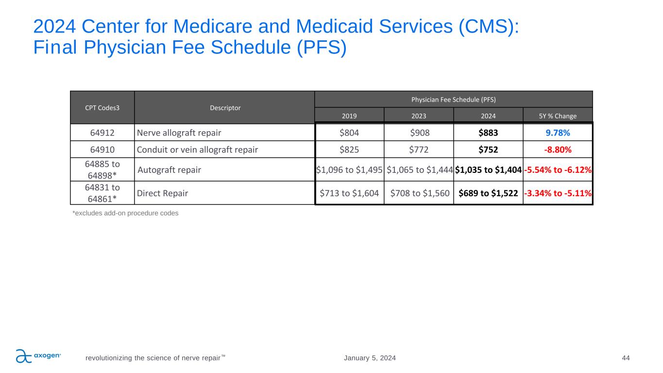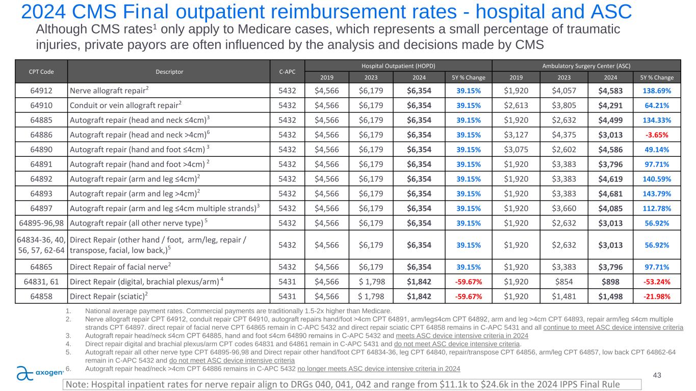 CPT Code Descriptor C-APC Hospital Outpatient (HOPD) Ambulatory Surgery Center (ASC) 2019 2023 2024 5Y % Change 2019 2023 2024 5Y % Change 64912 Nerve allograft repair2 5432 $4,566 $6,179 $6,354 39.15% $1,920 $4,057 $4,583 138.69% 64910 Conduit or vein allograft repair2 5432 $4,566 $6,179 $6,354 39.15% $2,613 $3,805 $4,291 64.21% 64885 Autograft repair (head and neck ≤4cm)3 5432 $4,566 $6,179 $6,354 39.15% $1,920 $2,632 $4,499 134.33% 64886 Autograft repair (head and neck >4cm)6 5432 $4,566 $6,179 $6,354 39.15% $3,127 $4,375 $3,013 -3.65% 64890 Autograft repair (hand and foot ≤4cm) 3 5432 $4,566 $6,179 $6,354 39.15% $3,075 $2,602 $4,586 49.14% 64891 Autograft repair (hand and foot >4cm) 2 5432 $4,566 $6,179 $6,354 39.15% $1,920 $3,383 $3,796 97.71% 64892 Autograft repair (arm and leg ≤4cm)2 5432 $4,566 $6,179 $6,354 39.15% $1,920 $3,383 $4,619 140.59% 64893 Autograft repair (arm and leg >4cm)2 5432 $4,566 $6,179 $6,354 39.15% $1,920 $3,383 $4,681 143.79% 64897 Autograft repair (arm and leg ≤4cm multiple strands)3 5432 $4,566 $6,179 $6,354 39.15% $1,920 $3,660 $4,085 112.78% 64895-96,98 Autograft repair (all other nerve type) 5 5432 $4,566 $6,179 $6,354 39.15% $1,920 $2,632 $3,013 56.92% 64834-36, 40, 56, 57, 62-64 Direct Repair (other hand / foot, arm/leg, repair / transpose, facial, low back,)5 5432 $4,566 $6,179 $6,354 39.15% $1,920 $2,632 $3,013 56.92% 64865 Direct Repair of facial nerve2 5432 $4,566 $6,179 $6,354 39.15% $1,920 $3,383 $3,796 97.71% 64831, 61 Direct Repair (digital, brachial plexus/arm) 4 5431 $4,566 $ 1,798 $1,842 -59.67% $1,920 $854 $898 -53.24% 64858 Direct Repair (sciatic)2 5431 $4,566 $ 1,798 $1,842 -59.67% $1,920 $1,481 $1,498 -21.98% 2024 CMS Final outpatient reimbursement rates - hospital and ASC 43 Although CMS rates1 only apply to Medicare cases, which represents a small percentage of traumatic injuries, private payors are often influenced by the analysis and decisions made by CMS 1. National average payment rates. Commercial payments are traditionally 1.5-2x higher than Medicare. 2. Nerve allograft repair CPT 64912, conduit repair CPT 64910, autograft repairs hand/foot >4cm CPT 64891, arm/leg≤4cm CPT 64892, arm and leg >4cm CPT 64893, repair arm/leg ≤4cm multiple strands CPT 64897. direct repair of facial nerve CPT 64865 remain in C-APC 5432 and direct repair sciatic CPT 64858 remains in C-APC 5431 and all continue to meet ASC device intensive criteria 3. Autograft repair head/neck ≤4cm CPT 64885, hand and foot ≤4cm 64890 remains in C-APC 5432 and meets ASC device intensive criteria in 2024 4. Direct repair digital and brachial plexus/arm CPT codes 64831 and 64861 remain in C-APC 5431 and do not meet ASC device intensive criteria. 5. Autograft repair all other nerve type CPT 64895-96,98 and Direct repair other hand/foot CPT 64834-36, leg CPT 64840, repair/transpose CPT 64856, arm/leg CPT 64857, low back CPT 64862-64 remain in C-APC 5432 and do not meet ASC device intensive criteria 6. Autograft repair head/neck >4cm CPT 64886 remains in C-APC 5432 no longer meets ASC device intensive criteria in 2024 Note: Hospital inpatient rates for nerve repair align to DRGs 040, 041, 042 and range from $11.1k to $24.6k in the 2024 IPPS Final Rule