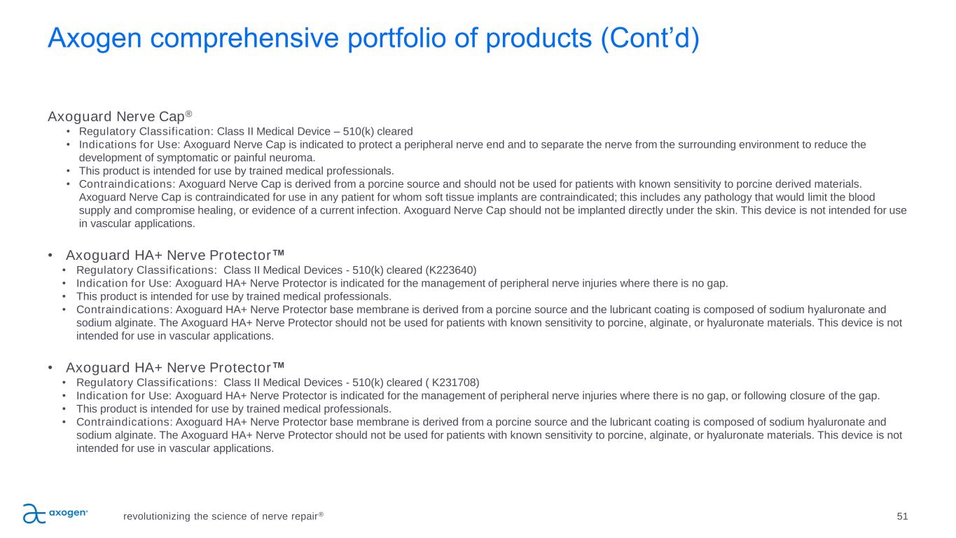 Axogen comprehensive portfolio of products Avance® Nerve Graft • Regulatory Classification: Avance Nerve Graft is processed and distributed in accordance with U.S. Food and Drug Administration (FDA) requirements for Human Cellular and Tissue-based Products (HCT/P) under 21 CFR Part 1271 regulations, U.S. State regulations and the guidelines of the American Association of Tissue Banks (AATB). Additionally, international regulations are followed as appropriate. • Indication for Use: Avance Nerve Graft is processed nerve allograft (human) intended for the surgical repair of peripheral nerve discontinuities to support regeneration across the defect. • Contraindications: Avance Nerve Graft is contraindicated for use in any patient in whom soft tissue implants are contraindicated. This includes any pathology that would limit the blood supply and compromise healing or evidence of a current infection. Axoguard Nerve Connector ® • Regulatory Classifications: Class II Medical Devices - 510(k) cleared, Class III Medical Devices, CE Marked (EU), Class 4 (CA) • Indications for Use (US): The Axoguard Nerve Connector is indicated for the repair of peripheral nerve discontinuities where gap closure can be achieved by flexion of the extremity. The Axoguard Nerve Connector is supplied sterile and is intended for single use. • This product is intended for use by trained medical professionals. • Indications for Use (EU and UK): The Axoguard Nerve Connector is indicated for the repair of peripheral nerve discontinuities with gaps up to 5 mm. The Axoguard Nerve Connector is supplied sterile and is intended for single use. • This product is intended for use by trained medical professionals. • Contraindications: This device is derived from a porcine source and should not be used for patients with known sensitivity to porcine material. This device is not intended for use in vascular applications. Axoguard Nerve Protector ® • Regulatory Classifications: Class II Medical Devices - 510(k) cleared, Class III Medical Device, CE Marked (EU), Class 4 (CA) • Indication for Use: Axoguard Nerve Protector is indicated for the repair of peripheral nerve injuries in which there is no gap. The Axoguard Nerve Connector is supplied sterile and is intended for single use. • This product is intended for use by trained medical professionals. • Contraindications: This device is derived from a porcine source and should not be used for patients with known sensitivity to porcine material. This device is not intended for use in vascular applications. 50revolutionizing the science of nerve repair®