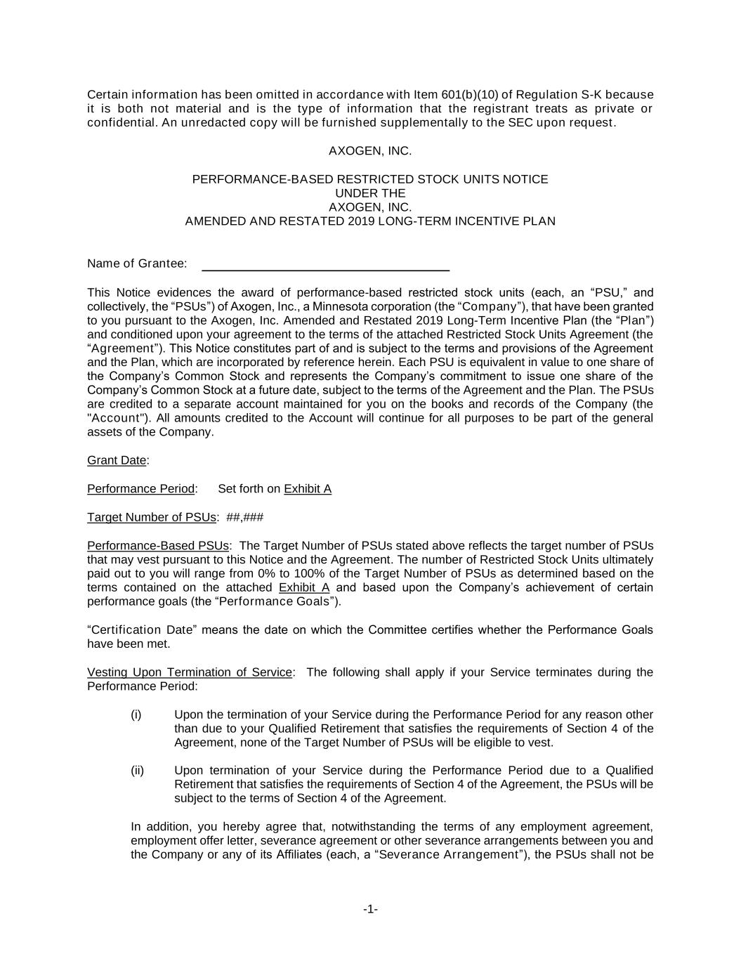 -1- Certain information has been omitted in accordance with Item 601(b)(10) of Regulation S-K because it is both not material and is the type of information that the registrant treats as private or confidential. An unredacted copy will be furnished supplementally to the SEC upon request. AXOGEN, INC. PERFORMANCE-BASED RESTRICTED STOCK UNITS NOTICE UNDER THE AXOGEN, INC. AMENDED AND RESTATED 2019 LONG-TERM INCENTIVE PLAN Name of Grantee: This Notice evidences the award of performance-based restricted stock units (each, an “PSU,” and collectively, the “PSUs”) of Axogen, Inc., a Minnesota corporation (the “Company”), that have been granted to you pursuant to the Axogen, Inc. Amended and Restated 2019 Long-Term Incentive Plan (the “Plan”) and conditioned upon your agreement to the terms of the attached Restricted Stock Units Agreement (the “Agreement”). This Notice constitutes part of and is subject to the terms and provisions of the Agreement and the Plan, which are incorporated by reference herein. Each PSU is equivalent in value to one share of the Company’s Common Stock and represents the Company’s commitment to issue one share of the Company’s Common Stock at a future date, subject to the terms of the Agreement and the Plan. The PSUs are credited to a separate account maintained for you on the books and records of the Company (the "Account"). All amounts credited to the Account will continue for all purposes to be part of the general assets of the Company. Grant Date: Performance Period: Set forth on Exhibit A Target Number of PSUs: ##,### Performance-Based PSUs: The Target Number of PSUs stated above reflects the target number of PSUs that may vest pursuant to this Notice and the Agreement. The number of Restricted Stock Units ultimately paid out to you will range from 0% to 100% of the Target Number of PSUs as determined based on the terms contained on the attached Exhibit A and based upon the Company’s achievement of certain performance goals (the “Performance Goals”). “Certification Date” means the date on which the Committee certifies whether the Performance Goals have been met. Vesting Upon Termination of Service: The following shall apply if your Service terminates during the Performance Period: (i) Upon the termination of your Service during the Performance Period for any reason other than due to your Qualified Retirement that satisfies the requirements of Section 4 of the Agreement, none of the Target Number of PSUs will be eligible to vest. (ii) Upon termination of your Service during the Performance Period due to a Qualified Retirement that satisfies the requirements of Section 4 of the Agreement, the PSUs will be subject to the terms of Section 4 of the Agreement. In addition, you hereby agree that, notwithstanding the terms of any employment agreement, employment offer letter, severance agreement or other severance arrangements between you and the Company or any of its Affiliates (each, a “Severance Arrangement”), the PSUs shall not be