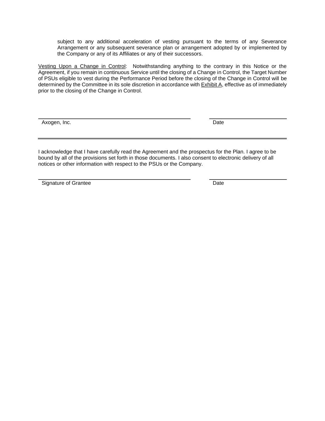 subject to any additional acceleration of vesting pursuant to the terms of any Severance Arrangement or any subsequent severance plan or arrangement adopted by or implemented by the Company or any of its Affiliates or any of their successors. Vesting Upon a Change in Control: Notwithstanding anything to the contrary in this Notice or the Agreement, if you remain in continuous Service until the closing of a Change in Control, the Target Number of PSUs eligible to vest during the Performance Period before the closing of the Change in Control will be determined by the Committee in its sole discretion in accordance with Exhibit A, effective as of immediately prior to the closing of the Change in Control. Axogen, Inc. Date I acknowledge that I have carefully read the Agreement and the prospectus for the Plan. I agree to be bound by all of the provisions set forth in those documents. I also consent to electronic delivery of all notices or other information with respect to the PSUs or the Company. Signature of Grantee Date