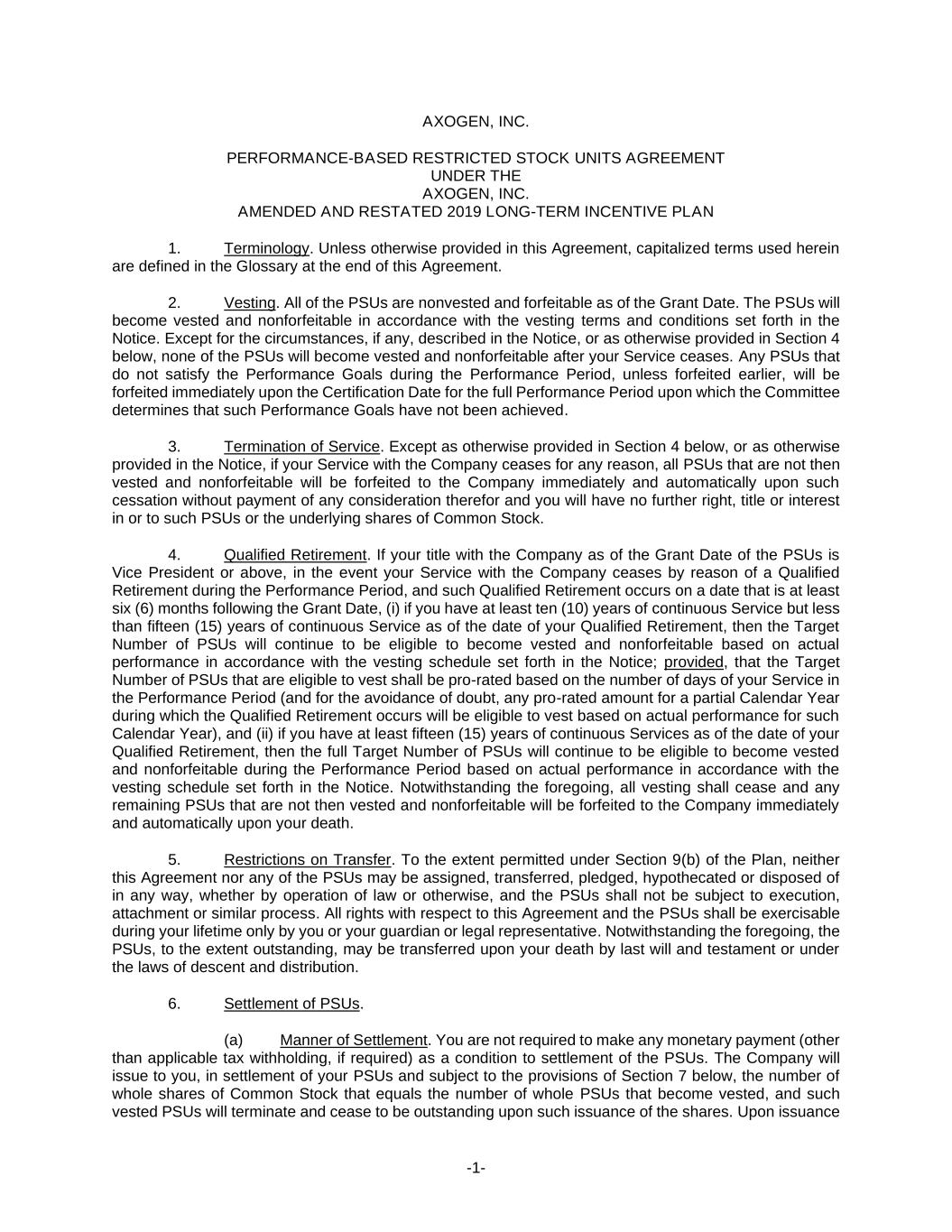 -1- AXOGEN, INC. PERFORMANCE-BASED RESTRICTED STOCK UNITS AGREEMENT UNDER THE AXOGEN, INC. AMENDED AND RESTATED 2019 LONG-TERM INCENTIVE PLAN 1. Terminology. Unless otherwise provided in this Agreement, capitalized terms used herein are defined in the Glossary at the end of this Agreement. 2. Vesting. All of the PSUs are nonvested and forfeitable as of the Grant Date. The PSUs will become vested and nonforfeitable in accordance with the vesting terms and conditions set forth in the Notice. Except for the circumstances, if any, described in the Notice, or as otherwise provided in Section 4 below, none of the PSUs will become vested and nonforfeitable after your Service ceases. Any PSUs that do not satisfy the Performance Goals during the Performance Period, unless forfeited earlier, will be forfeited immediately upon the Certification Date for the full Performance Period upon which the Committee determines that such Performance Goals have not been achieved. 3. Termination of Service. Except as otherwise provided in Section 4 below, or as otherwise provided in the Notice, if your Service with the Company ceases for any reason, all PSUs that are not then vested and nonforfeitable will be forfeited to the Company immediately and automatically upon such cessation without payment of any consideration therefor and you will have no further right, title or interest in or to such PSUs or the underlying shares of Common Stock. 4. Qualified Retirement. If your title with the Company as of the Grant Date of the PSUs is Vice President or above, in the event your Service with the Company ceases by reason of a Qualified Retirement during the Performance Period, and such Qualified Retirement occurs on a date that is at least six (6) months following the Grant Date, (i) if you have at least ten (10) years of continuous Service but less than fifteen (15) years of continuous Service as of the date of your Qualified Retirement, then the Target Number of PSUs will continue to be eligible to become vested and nonforfeitable based on actual performance in accordance with the vesting schedule set forth in the Notice; provided, that the Target Number of PSUs that are eligible to vest shall be pro-rated based on the number of days of your Service in the Performance Period (and for the avoidance of doubt, any pro-rated amount for a partial Calendar Year during which the Qualified Retirement occurs will be eligible to vest based on actual performance for such Calendar Year), and (ii) if you have at least fifteen (15) years of continuous Services as of the date of your Qualified Retirement, then the full Target Number of PSUs will continue to be eligible to become vested and nonforfeitable during the Performance Period based on actual performance in accordance with the vesting schedule set forth in the Notice. Notwithstanding the foregoing, all vesting shall cease and any remaining PSUs that are not then vested and nonforfeitable will be forfeited to the Company immediately and automatically upon your death. 5. Restrictions on Transfer. To the extent permitted under Section 9(b) of the Plan, neither this Agreement nor any of the PSUs may be assigned, transferred, pledged, hypothecated or disposed of in any way, whether by operation of law or otherwise, and the PSUs shall not be subject to execution, attachment or similar process. All rights with respect to this Agreement and the PSUs shall be exercisable during your lifetime only by you or your guardian or legal representative. Notwithstanding the foregoing, the PSUs, to the extent outstanding, may be transferred upon your death by last will and testament or under the laws of descent and distribution. 6. Settlement of PSUs. (a) Manner of Settlement. You are not required to make any monetary payment (other than applicable tax withholding, if required) as a condition to settlement of the PSUs. The Company will issue to you, in settlement of your PSUs and subject to the provisions of Section 7 below, the number of whole shares of Common Stock that equals the number of whole PSUs that become vested, and such vested PSUs will terminate and cease to be outstanding upon such issuance of the shares. Upon issuance