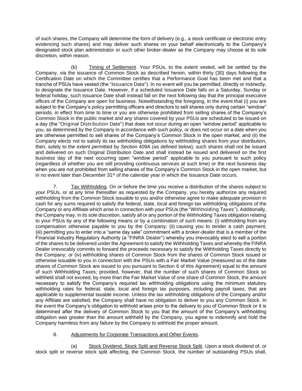 of such shares, the Company will determine the form of delivery (e.g., a stock certificate or electronic entry evidencing such shares) and may deliver such shares on your behalf electronically to the Company’s designated stock plan administrator or such other broker-dealer as the Company may choose at its sole discretion, within reason. (b) Timing of Settlement. Your PSUs, to the extent vested, will be settled by the Company, via the issuance of Common Stock as described herein, within thirty (30) days following the Certification Date on which the Committee certifies that a Performance Goal has been met and that a tranche of PSUs have vested (the “Issuance Date”). In no event will you be permitted, directly or indirectly, to designate the Issuance Date. However, if a scheduled Issuance Date falls on a Saturday, Sunday or federal holiday, such Issuance Date shall instead fall on the next following day that the principal executive offices of the Company are open for business. Notwithstanding the foregoing, in the event that (i) you are subject to the Company’s policy permitting officers and directors to sell shares only during certain “window” periods, in effect from time to time or you are otherwise prohibited from selling shares of the Company’s Common Stock in the public market and any shares covered by your PSUs are scheduled to be issued on a day (the “Original Distribution Date”) that does not occur during an open “window period” applicable to you, as determined by the Company in accordance with such policy, or does not occur on a date when you are otherwise permitted to sell shares of the Company’s Common Stock in the open market, and (ii) the Company elects not to satisfy its tax withholding obligations by withholding shares from your distribution, then, solely to the extent permitted by Section 409A (as defined below), such shares shall not be issued and delivered on such Original Distribution Date and shall instead be issued and delivered on the first business day of the next occurring open “window period” applicable to you pursuant to such policy (regardless of whether you are still providing continuous services at such time) or the next business day when you are not prohibited from selling shares of the Company’s Common Stock in the open market, but in no event later than December 31st of the calendar year in which the Issuance Date occurs. 7. Tax Withholding. On or before the time you receive a distribution of the shares subject to your PSUs, or at any time thereafter as requested by the Company, you hereby authorize any required withholding from the Common Stock issuable to you and/or otherwise agree to make adequate provision in cash for any sums required to satisfy the federal, state, local and foreign tax withholding obligations of the Company or any Affiliate which arise in connection with your PSUs (the “Withholding Taxes”). Additionally, the Company may, in its sole discretion, satisfy all or any portion of the Withholding Taxes obligation relating to your PSUs by any of the following means or by a combination of such means: (i) withholding from any compensation otherwise payable to you by the Company; (ii) causing you to tender a cash payment; (iii) permitting you to enter into a “same day sale” commitment with a broker-dealer that is a member of the Financial Industry Regulatory Authority (a “FINRA Dealer”) whereby you irrevocably elect to sell a portion of the shares to be delivered under the Agreement to satisfy the Withholding Taxes and whereby the FINRA Dealer irrevocably commits to forward the proceeds necessary to satisfy the Withholding Taxes directly to the Company; or (iv) withholding shares of Common Stock from the shares of Common Stock issued or otherwise issuable to you in connection with the PSUs with a Fair Market Value (measured as of the date shares of Common Stock are issued to you pursuant to Section 6 of this Agreement) equal to the amount of such Withholding Taxes; provided, however, that the number of such shares of Common Stock so withheld shall not exceed, by more than the Fair Market Value of one share of Common Stock, the amount necessary to satisfy the Company’s required tax withholding obligations using the minimum statutory withholding rates for federal, state, local and foreign tax purposes, including payroll taxes, that are applicable to supplemental taxable income. Unless the tax withholding obligations of the Company and/or any Affiliate are satisfied, the Company shall have no obligation to deliver to you any Common Stock. In the event the Company’s obligation to withhold arises prior to the delivery to you of Common Stock or it is determined after the delivery of Common Stock to you that the amount of the Company’s withholding obligation was greater than the amount withheld by the Company, you agree to indemnify and hold the Company harmless from any failure by the Company to withhold the proper amount. 8. Adjustments for Corporate Transactions and Other Events. (a) Stock Dividend, Stock Split and Reverse Stock Split. Upon a stock dividend of, or stock split or reverse stock split affecting, the Common Stock, the number of outstanding PSUs shall,