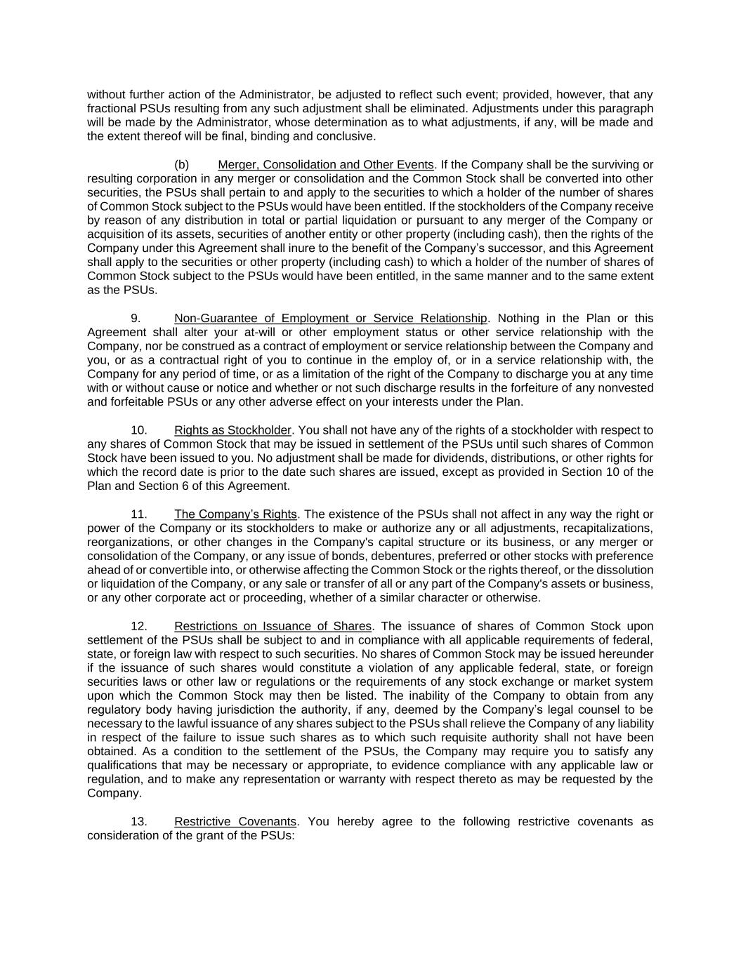 without further action of the Administrator, be adjusted to reflect such event; provided, however, that any fractional PSUs resulting from any such adjustment shall be eliminated. Adjustments under this paragraph will be made by the Administrator, whose determination as to what adjustments, if any, will be made and the extent thereof will be final, binding and conclusive. (b) Merger, Consolidation and Other Events. If the Company shall be the surviving or resulting corporation in any merger or consolidation and the Common Stock shall be converted into other securities, the PSUs shall pertain to and apply to the securities to which a holder of the number of shares of Common Stock subject to the PSUs would have been entitled. If the stockholders of the Company receive by reason of any distribution in total or partial liquidation or pursuant to any merger of the Company or acquisition of its assets, securities of another entity or other property (including cash), then the rights of the Company under this Agreement shall inure to the benefit of the Company’s successor, and this Agreement shall apply to the securities or other property (including cash) to which a holder of the number of shares of Common Stock subject to the PSUs would have been entitled, in the same manner and to the same extent as the PSUs. 9. Non-Guarantee of Employment or Service Relationship. Nothing in the Plan or this Agreement shall alter your at-will or other employment status or other service relationship with the Company, nor be construed as a contract of employment or service relationship between the Company and you, or as a contractual right of you to continue in the employ of, or in a service relationship with, the Company for any period of time, or as a limitation of the right of the Company to discharge you at any time with or without cause or notice and whether or not such discharge results in the forfeiture of any nonvested and forfeitable PSUs or any other adverse effect on your interests under the Plan. 10. Rights as Stockholder. You shall not have any of the rights of a stockholder with respect to any shares of Common Stock that may be issued in settlement of the PSUs until such shares of Common Stock have been issued to you. No adjustment shall be made for dividends, distributions, or other rights for which the record date is prior to the date such shares are issued, except as provided in Section 10 of the Plan and Section 6 of this Agreement. 11. The Company’s Rights. The existence of the PSUs shall not affect in any way the right or power of the Company or its stockholders to make or authorize any or all adjustments, recapitalizations, reorganizations, or other changes in the Company's capital structure or its business, or any merger or consolidation of the Company, or any issue of bonds, debentures, preferred or other stocks with preference ahead of or convertible into, or otherwise affecting the Common Stock or the rights thereof, or the dissolution or liquidation of the Company, or any sale or transfer of all or any part of the Company's assets or business, or any other corporate act or proceeding, whether of a similar character or otherwise. 12. Restrictions on Issuance of Shares. The issuance of shares of Common Stock upon settlement of the PSUs shall be subject to and in compliance with all applicable requirements of federal, state, or foreign law with respect to such securities. No shares of Common Stock may be issued hereunder if the issuance of such shares would constitute a violation of any applicable federal, state, or foreign securities laws or other law or regulations or the requirements of any stock exchange or market system upon which the Common Stock may then be listed. The inability of the Company to obtain from any regulatory body having jurisdiction the authority, if any, deemed by the Company’s legal counsel to be necessary to the lawful issuance of any shares subject to the PSUs shall relieve the Company of any liability in respect of the failure to issue such shares as to which such requisite authority shall not have been obtained. As a condition to the settlement of the PSUs, the Company may require you to satisfy any qualifications that may be necessary or appropriate, to evidence compliance with any applicable law or regulation, and to make any representation or warranty with respect thereto as may be requested by the Company. 13. Restrictive Covenants. You hereby agree to the following restrictive covenants as consideration of the grant of the PSUs: