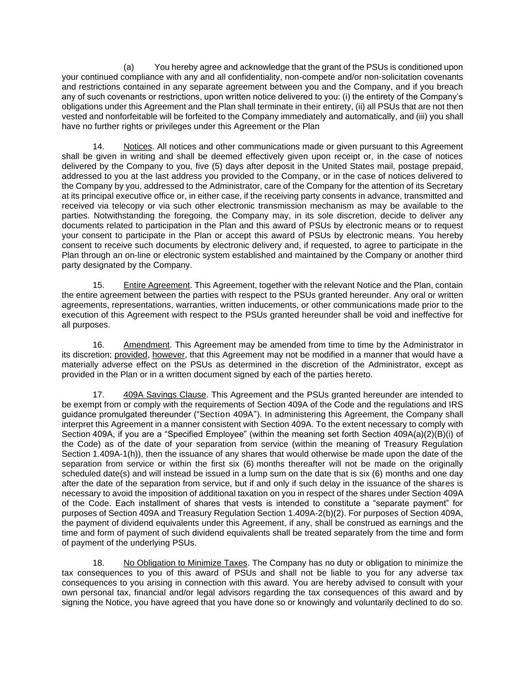 (a) You hereby agree and acknowledge that the grant of the PSUs is conditioned upon your continued compliance with any and all confidentiality, non-compete and/or non-solicitation covenants and restrictions contained in any separate agreement between you and the Company, and if you breach any of such covenants or restrictions, upon written notice delivered to you: (i) the entirety of the Company’s obligations under this Agreement and the Plan shall terminate in their entirety, (ii) all PSUs that are not then vested and nonforfeitable will be forfeited to the Company immediately and automatically, and (iii) you shall have no further rights or privileges under this Agreement or the Plan 14. Notices. All notices and other communications made or given pursuant to this Agreement shall be given in writing and shall be deemed effectively given upon receipt or, in the case of notices delivered by the Company to you, five (5) days after deposit in the United States mail, postage prepaid, addressed to you at the last address you provided to the Company, or in the case of notices delivered to the Company by you, addressed to the Administrator, care of the Company for the attention of its Secretary at its principal executive office or, in either case, if the receiving party consents in advance, transmitted and received via telecopy or via such other electronic transmission mechanism as may be available to the parties. Notwithstanding the foregoing, the Company may, in its sole discretion, decide to deliver any documents related to participation in the Plan and this award of PSUs by electronic means or to request your consent to participate in the Plan or accept this award of PSUs by electronic means. You hereby consent to receive such documents by electronic delivery and, if requested, to agree to participate in the Plan through an on-line or electronic system established and maintained by the Company or another third party designated by the Company. 15. Entire Agreement. This Agreement, together with the relevant Notice and the Plan, contain the entire agreement between the parties with respect to the PSUs granted hereunder. Any oral or written agreements, representations, warranties, written inducements, or other communications made prior to the execution of this Agreement with respect to the PSUs granted hereunder shall be void and ineffective for all purposes. 16. Amendment. This Agreement may be amended from time to time by the Administrator in its discretion; provided, however, that this Agreement may not be modified in a manner that would have a materially adverse effect on the PSUs as determined in the discretion of the Administrator, except as provided in the Plan or in a written document signed by each of the parties hereto. 17. 409A Savings Clause. This Agreement and the PSUs granted hereunder are intended to be exempt from or comply with the requirements of Section 409A of the Code and the regulations and IRS guidance promulgated thereunder (“Section 409A”). In administering this Agreement, the Company shall interpret this Agreement in a manner consistent with Section 409A. To the extent necessary to comply with Section 409A, if you are a “Specified Employee” (within the meaning set forth Section 409A(a)(2)(B)(i) of the Code) as of the date of your separation from service (within the meaning of Treasury Regulation Section 1.409A-1(h)), then the issuance of any shares that would otherwise be made upon the date of the separation from service or within the first six (6) months thereafter will not be made on the originally scheduled date(s) and will instead be issued in a lump sum on the date that is six (6) months and one day after the date of the separation from service, but if and only if such delay in the issuance of the shares is necessary to avoid the imposition of additional taxation on you in respect of the shares under Section 409A of the Code. Each installment of shares that vests is intended to constitute a “separate payment” for purposes of Section 409A and Treasury Regulation Section 1.409A-2(b)(2). For purposes of Section 409A, the payment of dividend equivalents under this Agreement, if any, shall be construed as earnings and the time and form of payment of such dividend equivalents shall be treated separately from the time and form of payment of the underlying PSUs. 18. No Obligation to Minimize Taxes. The Company has no duty or obligation to minimize the tax consequences to you of this award of PSUs and shall not be liable to you for any adverse tax consequences to you arising in connection with this award. You are hereby advised to consult with your own personal tax, financial and/or legal advisors regarding the tax consequences of this award and by signing the Notice, you have agreed that you have done so or knowingly and voluntarily declined to do so.
