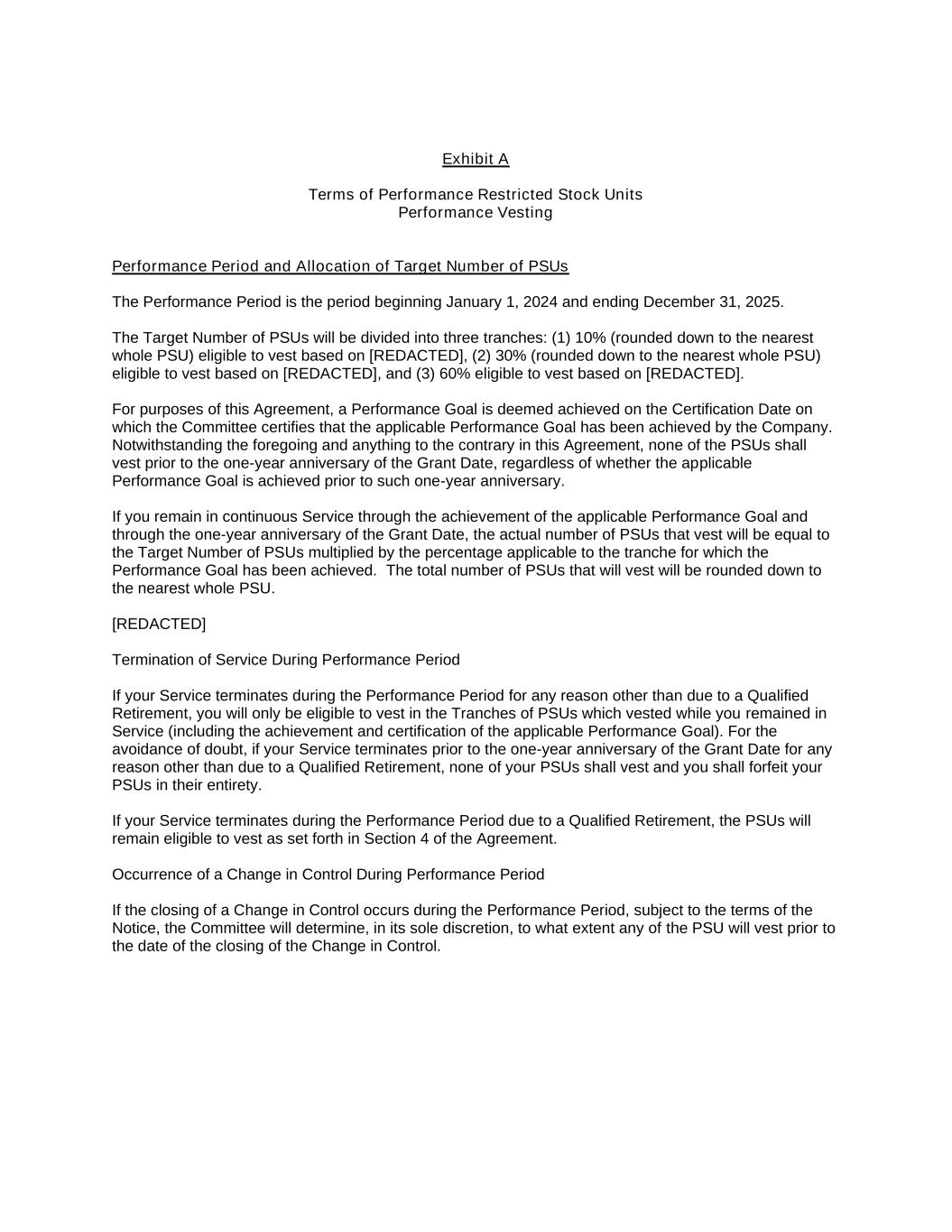 Exhibit A Terms of Performance Restricted Stock Units Performance Vesting Performance Period and Allocation of Target Number of PSUs The Performance Period is the period beginning January 1, 2024 and ending December 31, 2025. The Target Number of PSUs will be divided into three tranches: (1) 10% (rounded down to the nearest whole PSU) eligible to vest based on [REDACTED], (2) 30% (rounded down to the nearest whole PSU) eligible to vest based on [REDACTED], and (3) 60% eligible to vest based on [REDACTED]. For purposes of this Agreement, a Performance Goal is deemed achieved on the Certification Date on which the Committee certifies that the applicable Performance Goal has been achieved by the Company. Notwithstanding the foregoing and anything to the contrary in this Agreement, none of the PSUs shall vest prior to the one-year anniversary of the Grant Date, regardless of whether the applicable Performance Goal is achieved prior to such one-year anniversary. If you remain in continuous Service through the achievement of the applicable Performance Goal and through the one-year anniversary of the Grant Date, the actual number of PSUs that vest will be equal to the Target Number of PSUs multiplied by the percentage applicable to the tranche for which the Performance Goal has been achieved. The total number of PSUs that will vest will be rounded down to the nearest whole PSU. [REDACTED] Termination of Service During Performance Period If your Service terminates during the Performance Period for any reason other than due to a Qualified Retirement, you will only be eligible to vest in the Tranches of PSUs which vested while you remained in Service (including the achievement and certification of the applicable Performance Goal). For the avoidance of doubt, if your Service terminates prior to the one-year anniversary of the Grant Date for any reason other than due to a Qualified Retirement, none of your PSUs shall vest and you shall forfeit your PSUs in their entirety. If your Service terminates during the Performance Period due to a Qualified Retirement, the PSUs will remain eligible to vest as set forth in Section 4 of the Agreement. Occurrence of a Change in Control During Performance Period If the closing of a Change in Control occurs during the Performance Period, subject to the terms of the Notice, the Committee will determine, in its sole discretion, to what extent any of the PSU will vest prior to the date of the closing of the Change in Control.