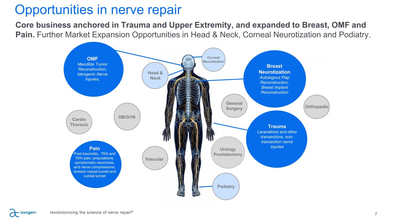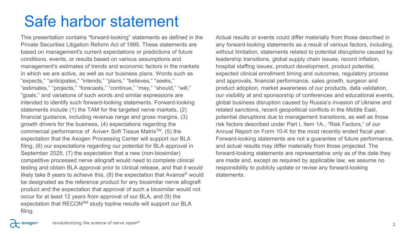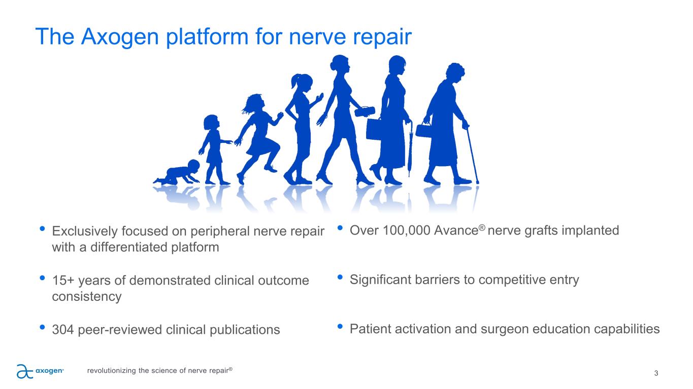 2 Safe harbor statement revolutionizing the science of nerve repair® This presentation contains “forward-looking” statements as defined in the Private Securities Litigation Reform Act of 1995. These statements are based on management's current expectations or predictions of future conditions, events, or results based on various assumptions and management's estimates of trends and economic factors in the markets in which we are active, as well as our business plans. Words such as “expects,” “anticipates,” “intends,” “plans,” “believes,” “seeks,” “estimates,” “projects,” “forecasts,” “continue,” “may,” “should,” “will,” “goals,” and variations of such words and similar expressions are intended to identify such forward-looking statements. Forward-looking statements include (1) the TAM for the targeted nerve markets, (2) financial guidance, including revenue range and gross margins, (3) growth drivers for the business, (4) expectations regarding the commercial performance of Avive+ Soft Tissue MatrixTM, (5) the expectation that the Axogen Processing Center will support our BLA filing, (6) our expectations regarding our potential for BLA approval in September 2025, (7) the expectation that a new (non-biosimilar) competitive processed nerve allograft would need to complete clinical testing and obtain BLA approval prior to clinical release, and that it would likely take 8 years to achieve this, (8) the expectation that Avance® would be designated as the reference product for any biosimilar nerve allograft product and the expectation that approval of such a biosimilar would not occur for at least 12 years from approval of our BLA, and (9) the expectation that RECONSM study topline results will support our BLA filing. Actual results or events could differ materially from those described in any forward-looking statements as a result of various factors, including, without limitation, statements related to potential disruptions caused by leadership transitions, global supply chain issues, record inflation, hospital staffing issues, product development, product potential, expected clinical enrollment timing and outcomes, regulatory process and approvals, financial performance, sales growth, surgeon and product adoption, market awareness of our products, data validation, our visibility at and sponsorship of conferences and educational events, global business disruption caused by Russia’s invasion of Ukraine and related sanctions, recent geopolitical conflicts in the Middle East, potential disruptions due to management transitions, as well as those risk factors described under Part I, Item 1A., “Risk Factors,” of our Annual Report on Form 10-K for the most recently ended fiscal year. Forward-looking statements are not a guarantee of future performance, and actual results may differ materially from those projected. The forward-looking statements are representative only as of the date they are made and, except as required by applicable law, we assume no responsibility to publicly update or revise any forward-looking statements.