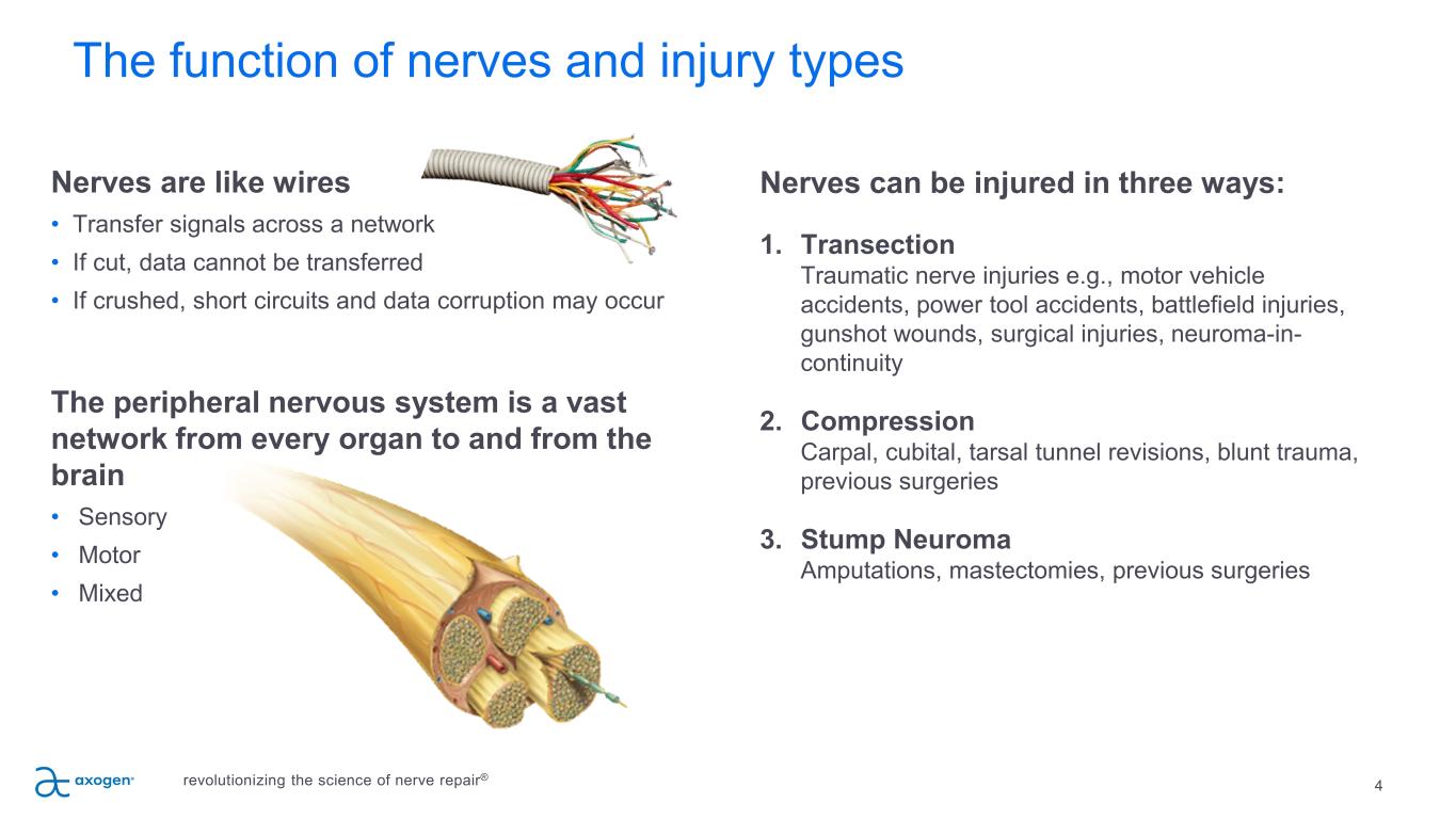 3 The Axogen platform for nerve repair revolutionizing the science of nerve repair® • Exclusively focused on peripheral nerve repair with a differentiated platform • 15+ years of demonstrated clinical outcome consistency • 304 peer-reviewed clinical publications • Over 100,000 Avance® nerve grafts implanted • Significant barriers to competitive entry • Patient activation and surgeon education capabilities