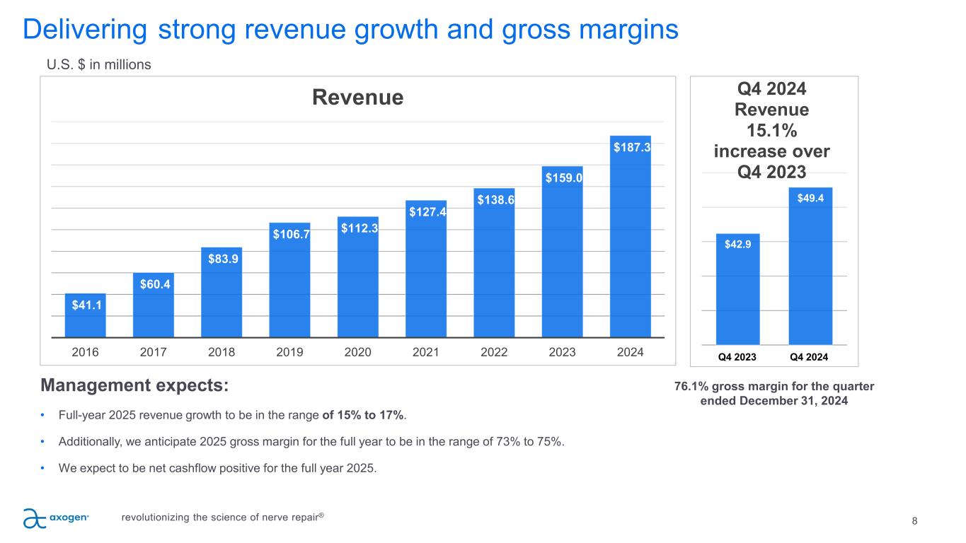 7 P IL L A R 5 Opportunities in nerve repair P IL L A R 4 P IL L A R 3 Pain Post-traumatic, TKA and TKH pain, amputations, symptomatic neuromas, and nerve compressions, revision carpal tunnel and cubital tunnel Core business anchored in Trauma and Upper Extremity, and expanded to Breast, OMF and Pain. Further Market Expansion Opportunities in Head & Neck, Corneal Neurotization and Podiatry. revolutionizing the science of nerve repair® Breast Neurotization Autologous Flap Reconstruction; Breast Implant Reconstruction Urology Prostatectomy OMF Mandible Tumor Reconstruction; Iatrogenic Nerve Injuries, Trauma Lacerations and other transections, non- transection nerve injuries Head & Neck OB/GYN General Surgery Cardio Thoracic Orthopedic Podiatry Vascular Corneal Neurotization