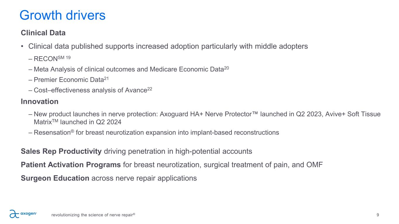 8 Delivering strong revenue growth and gross margins U.S. $ in millions revolutionizing the science of nerve repair® Management expects: • Full-year 2025 revenue growth to be in the range of 15% to 17%. • Additionally, we anticipate 2025 gross margin for the full year to be in the range of 73% to 75%. • We expect to be net cashflow positive for the full year 2025. $42.9 $49.4 Q4 2024 Revenue 15.1% increase over Q4 2023 76.1% gross margin for the quarter ended December 31, 2024 Q4 2023 Q4 2024 $41.1 $60.4 $83.9 $106.7 $112.3 $127.4 $138.6 $159.0 $187.3 2016 2017 2018 2019 2020 2021 2022 2023 2024 Revenue