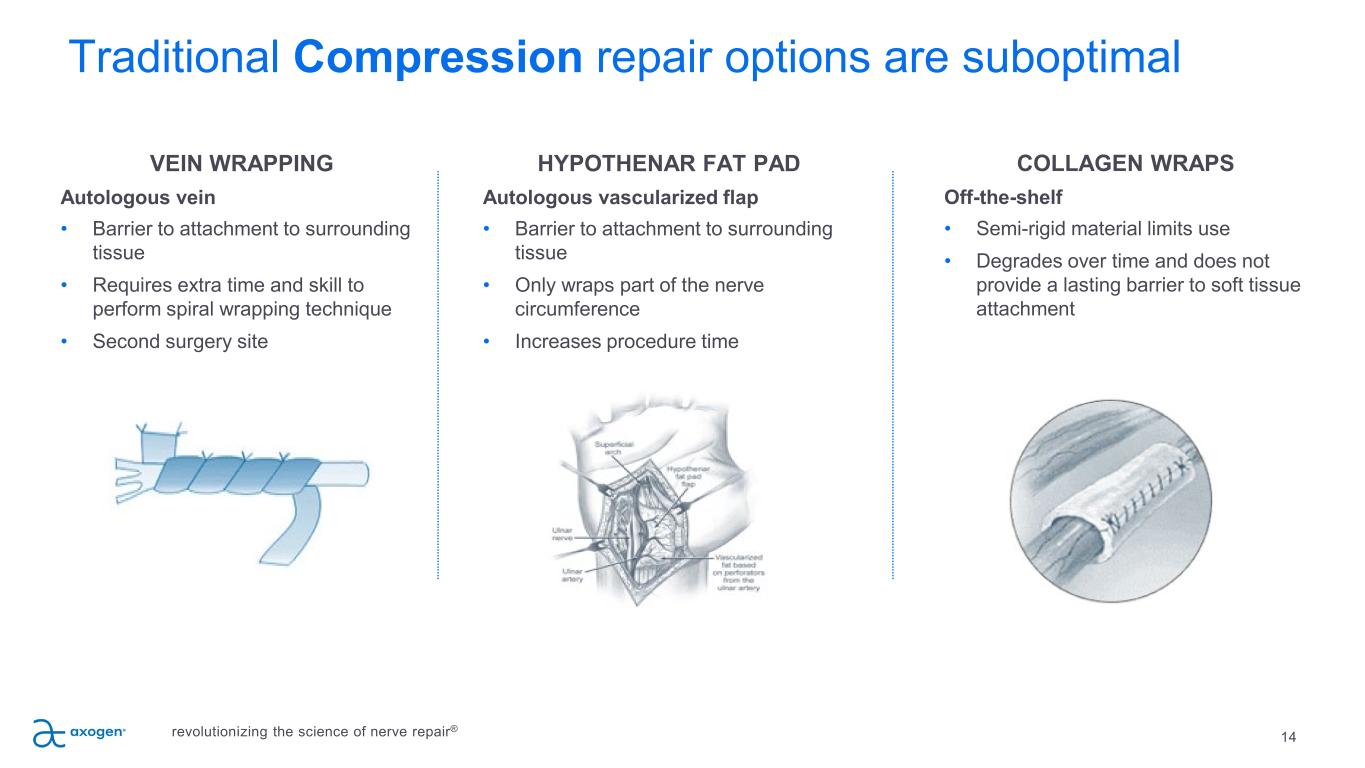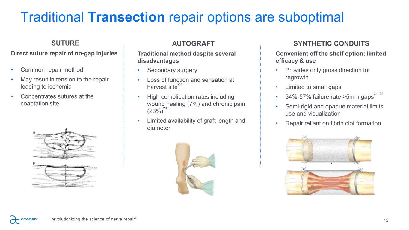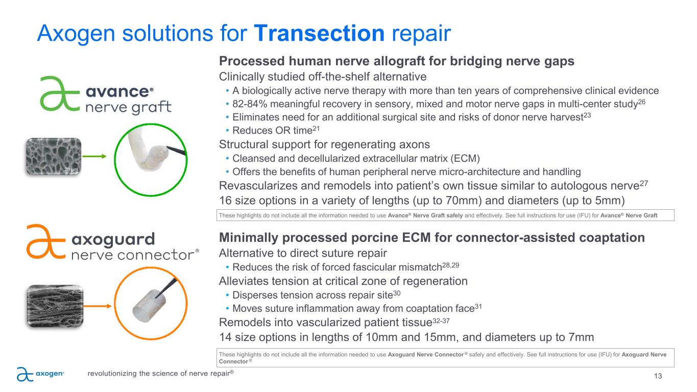 Traditional Transection repair options are suboptimal 12 SUTURE Direct suture repair of no-gap injuries • Common repair method • May result in tension to the repair leading to ischemia • Concentrates sutures at the coaptation site AUTOGRAFT Traditional method despite several disadvantages • Secondary surgery • Loss of function and sensation at harvest site23 • High complication rates including wound healing (7%) and chronic pain (23%)23 • Limited availability of graft length and diameter SYNTHETIC CONDUITS Convenient off the shelf option; limited efficacy & use • Provides only gross direction for regrowth • Limited to small gaps • 34%-57% failure rate >5mm gaps24, 25 • Semi-rigid and opaque material limits use and visualization • Repair reliant on fibrin clot formation revolutionizing the science of nerve repair®