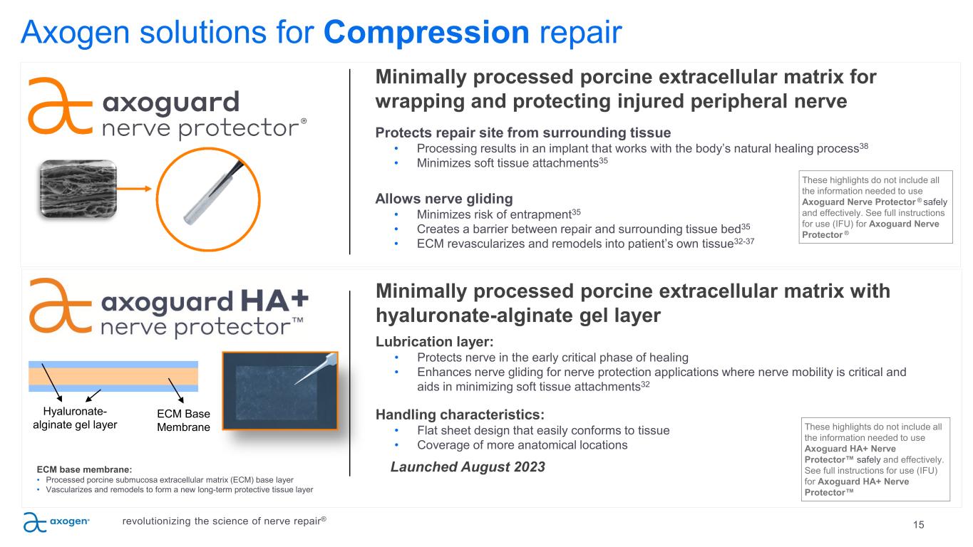 Traditional Compression repair options are suboptimal 14 VEIN WRAPPING Autologous vein • Barrier to attachment to surrounding tissue • Requires extra time and skill to perform spiral wrapping technique • Second surgery site HYPOTHENAR FAT PAD Autologous vascularized flap • Barrier to attachment to surrounding tissue • Only wraps part of the nerve circumference • Increases procedure time COLLAGEN WRAPS Off-the-shelf • Semi-rigid material limits use • Degrades over time and does not provide a lasting barrier to soft tissue attachment revolutionizing the science of nerve repair®