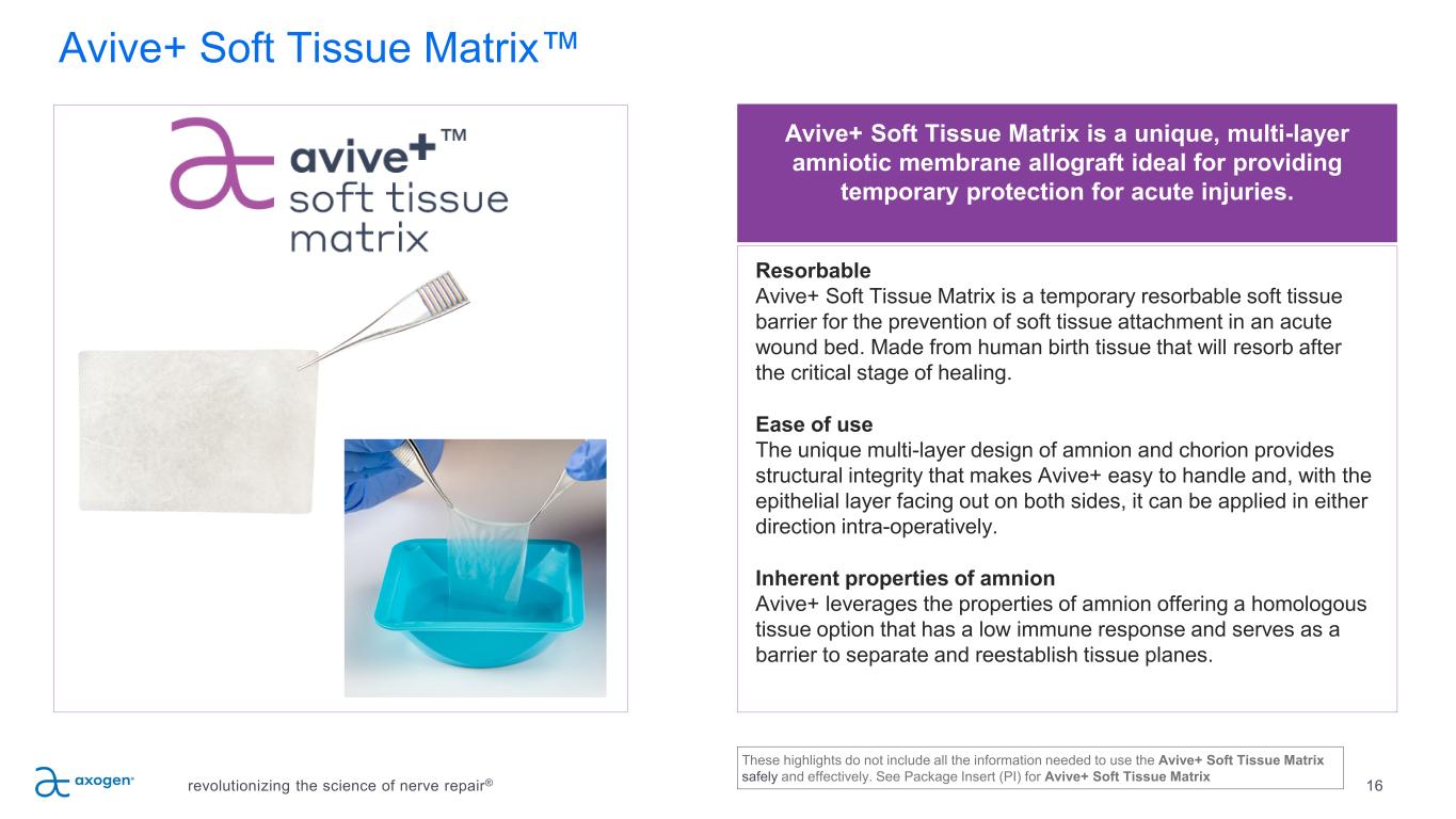 15 Axogen solutions for Compression repair Minimally processed porcine extracellular matrix for wrapping and protecting injured peripheral nerve Protects repair site from surrounding tissue • Processing results in an implant that works with the body’s natural healing process38 • Minimizes soft tissue attachments35 Allows nerve gliding • Minimizes risk of entrapment35 • Creates a barrier between repair and surrounding tissue bed35 • ECM revascularizes and remodels into patient’s own tissue32-37 revolutionizing the science of nerve repair® Hyaluronate- alginate gel layer ECM Base Membrane ECM base membrane: • Processed porcine submucosa extracellular matrix (ECM) base layer • Vascularizes and remodels to form a new long-term protective tissue layer Minimally processed porcine extracellular matrix with hyaluronate-alginate gel layer Lubrication layer: • Protects nerve in the early critical phase of healing • Enhances nerve gliding for nerve protection applications where nerve mobility is critical and aids in minimizing soft tissue attachments32 Handling characteristics: • Flat sheet design that easily conforms to tissue • Coverage of more anatomical locations Launched August 2023 These highlights do not include all the information needed to use Axoguard HA+ Nerve Protector safely and effectively. See full instructions for use (IFU) for Axoguard HA+ Nerve Protector These highlights do not include all the information needed to use Axoguard Nerve Protector ® safely and effectively. See full instructions for use (IFU) for Axoguard Nerve Protector ®