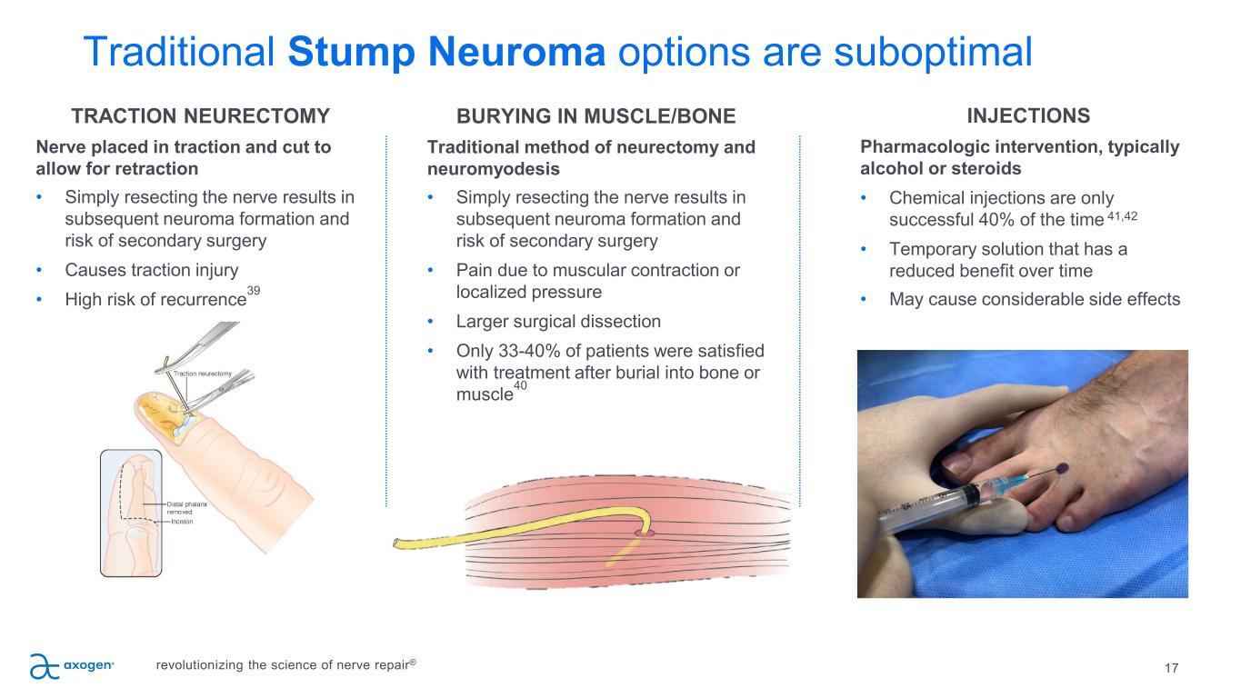 Traditional Stump Neuroma options are suboptimal 17 TRACTION NEURECTOMY Nerve placed in traction and cut to allow for retraction • Simply resecting the nerve results in subsequent neuroma formation and risk of secondary surgery • Causes traction injury • High risk of recurrence39 BURYING IN MUSCLE/BONE Traditional method of neurectomy and neuromyodesis • Simply resecting the nerve results in subsequent neuroma formation and risk of secondary surgery • Pain due to muscular contraction or localized pressure • Larger surgical dissection • Only 33-40% of patients were satisfied with treatment after burial into bone or muscle40 INJECTIONS Pharmacologic intervention, typically alcohol or steroids • Chemical injections are only successful 40% of the time 41,42 • Temporary solution that has a reduced benefit over time • May cause considerable side effects revolutionizing the science of nerve repair®