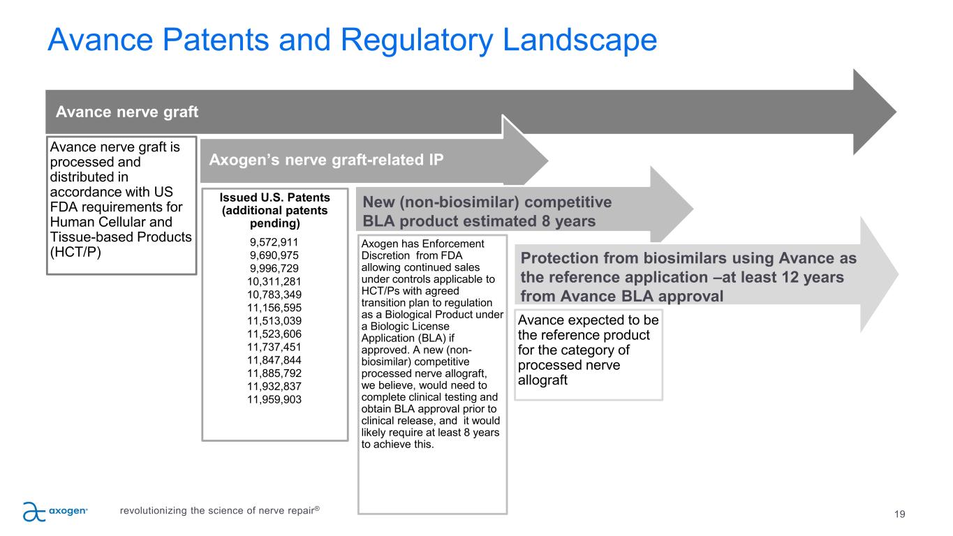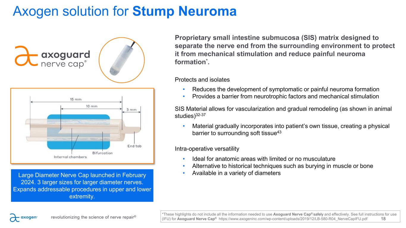 18 Axogen solution for Stump Neuroma Proprietary small intestine submucosa (SIS) matrix designed to separate the nerve end from the surrounding environment to protect it from mechanical stimulation and reduce painful neuroma formation*. Protects and isolates • Reduces the development of symptomatic or painful neuroma formation • Provides a barrier from neurotrophic factors and mechanical stimulation SIS Material allows for vascularization and gradual remodeling (as shown in animal studies)32-37 • Material gradually incorporates into patient’s own tissue, creating a physical barrier to surrounding soft tissue43 Intra-operative versatility • Ideal for anatomic areas with limited or no musculature • Alternative to historical techniques such as burying in muscle or bone • Available in a variety of diameters revolutionizing the science of nerve repair® Large Diameter Nerve Cap launched in February 2024. 3 larger sizes for larger diameter nerves. Expands addressable procedures in upper and lower extremity. *These highlights do not include all the information needed to use Axoguard Nerve Cap® safely and effectively. See full instructions for use (IFU) for Axoguard Nerve Cap® https://www.axogeninc.com/wp-content/uploads/2019/12/LB-580-R04_NerveCapIFU.pdf