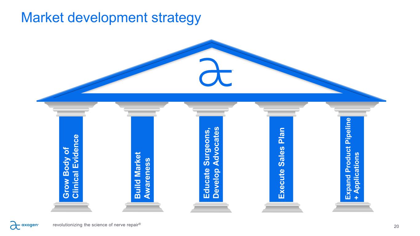19 Avance Patents and Regulatory Landscape Avance nerve graft is processed and distributed in accordance with US FDA requirements for Human Cellular and Tissue-based Products (HCT/P) Issued U.S. Patents (additional patents pending) Axogen has Enforcement Discretion from FDA allowing continued sales under controls applicable to HCT/Ps with agreed transition plan to regulation as a Biological Product under a Biologic License Application (BLA) if approved. A new (non- biosimilar) competitive processed nerve allograft, we believe, would need to complete clinical testing and obtain BLA approval prior to clinical release, and it would likely require at least 8 years to achieve this. Avance expected to be the reference product for the category of processed nerve allograft Avance nerve graft Axogen’s nerve graft-related IP New (non-biosimilar) competitive BLA product estimated 8 years Protection from biosimilars using Avance as the reference application –at least 12 years from Avance BLA approval 9,572,911 9,690,975 9,996,729 10,311,281 10,783,349 11,156,595 11,513,039 11,523,606 11,737,451 11,847,844 11,885,792 11,932,837 11,959,903 revolutionizing the science of nerve repair®