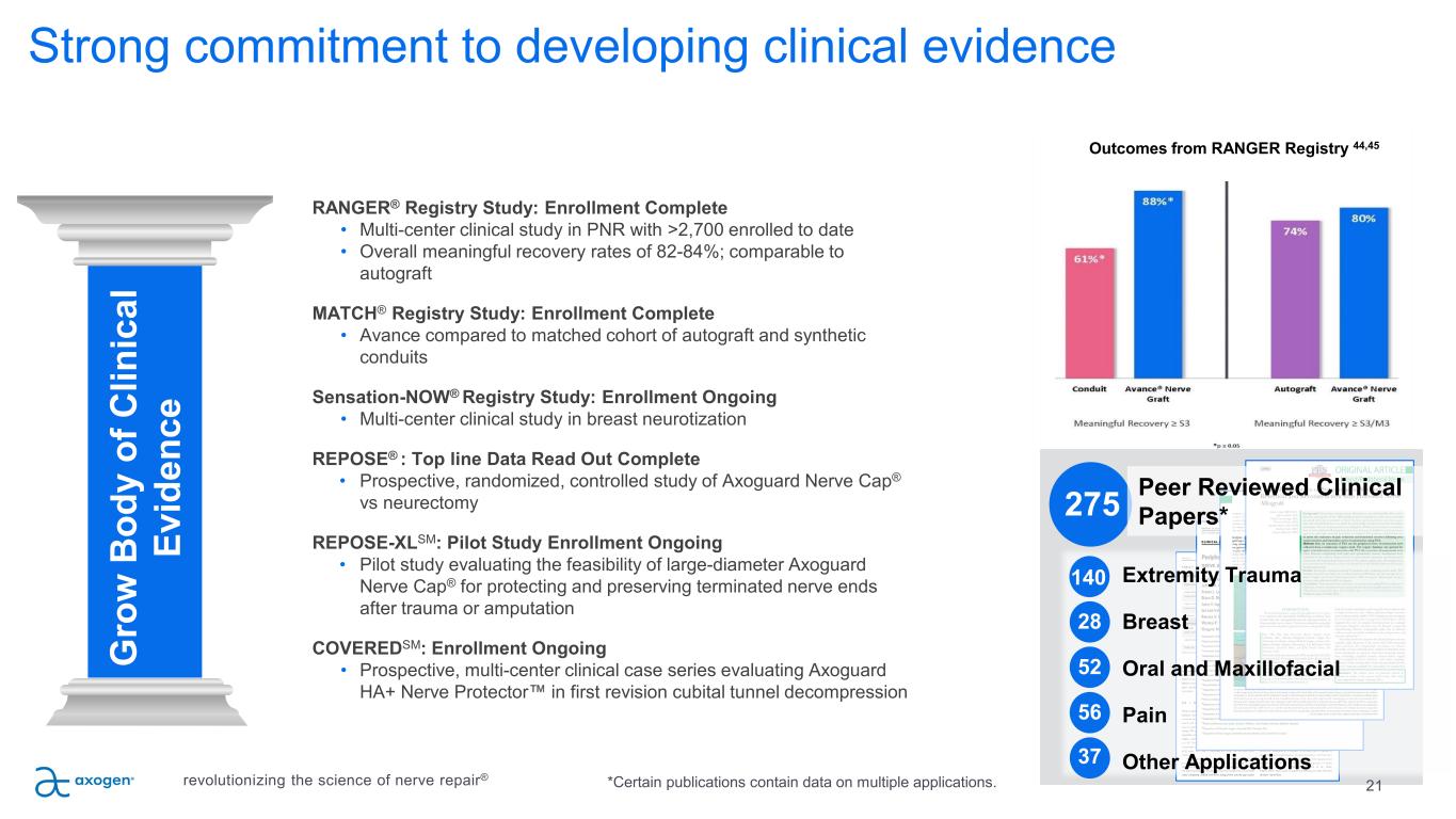 Outcomes from RANGER Registry 44,45 21 P IL L A R 3 Strong commitment to developing clinical evidence RANGER® Registry Study: Enrollment Complete • Multi-center clinical study in PNR with >2,700 enrolled to date • Overall meaningful recovery rates of 82-84%; comparable to autograft MATCH® Registry Study: Enrollment Complete • Avance compared to matched cohort of autograft and synthetic conduits Sensation-NOW® Registry Study: Enrollment Ongoing • Multi-center clinical study in breast neurotization REPOSE® : Top line Data Read Out Complete • Prospective, randomized, controlled study of Axoguard Nerve Cap® vs neurectomy REPOSE-XLSM: Pilot Study Enrollment Ongoing • Pilot study evaluating the feasibility of large-diameter Axoguard Nerve Cap® for protecting and preserving terminated nerve ends after trauma or amputation COVEREDSM: Enrollment Ongoing • Prospective, multi-center clinical case series evaluating Axoguard HA+ Nerve Protector in first revision cubital tunnel decompression G ro w B od y of C lin ic al Ev id en ce Extremity Trauma Breast Oral and Maxillofacial Pain Other Applications 140 28 52 56 37 275 *Certain publications contain data on multiple applications.revolutionizing the science of nerve repair® Peer Reviewed Clinical Papers*