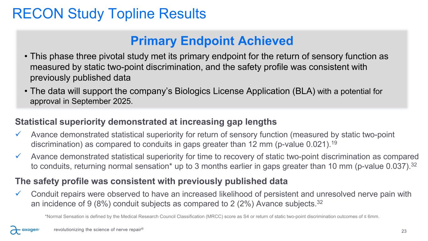 RECON : A Multicenter, Prospective, Randomized, Subject & Evaluator Blinded Comparative Study of Nerve Cuffs & Avance Nerve Graft Evaluating Recovery Outcomes for the Repair of Nerve Discontinuities 22 Safety & efficacy non- inferiority comparison of Avance vs conduit Evaluated upper extremity digital nerve repair for nerve gaps 5-25mm 220 subjects from up to 25 U.S. centers stratified into gap lengths with two-thirds in the 5-14mm group and one- third in the 15-25mm group revolutionizing the science of nerve repair® SM