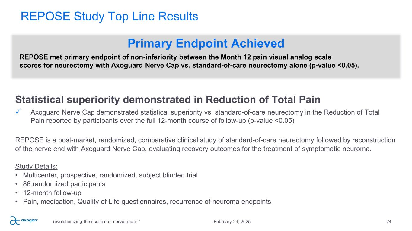 REPOSE Study Top Line Results revolutionizing the science of nerve repair 24February 24, 2025 Statistical superiority demonstrated in Reduction of Total Pain Axoguard Nerve Cap demonstrated statistical superiority vs. standard-of-care neurectomy in the Reduction of Total Pain reported by participants over the full 12-month course of follow-up (p-value <0.05) REPOSE is a post-market, randomized, comparative clinical study of standard-of-care neurectomy followed by reconstruction of the nerve end with Axoguard Nerve Cap, evaluating recovery outcomes for the treatment of symptomatic neuroma. Study Details: • Multicenter, prospective, randomized, subject blinded trial • 86 randomized participants • 12-month follow-up • Pain, medication, Quality of Life questionnaires, recurrence of neuroma endpoints Primary Endpoint Achieved REPOSE met primary endpoint of non-inferiority between the Month 12 pain visual analog scale scores for neurectomy with Axoguard Nerve Cap vs. standard-of-care neurectomy alone (p-value <0.05).
