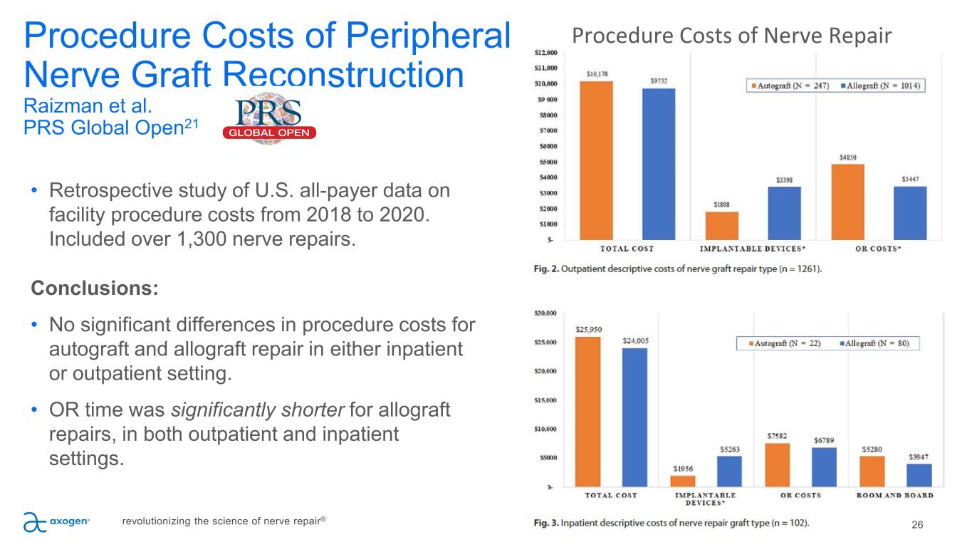Procedure Costs of Peripheral Nerve Graft Reconstruction Raizman et al. PRS Global Open21 26revolutionizing the science of nerve repair® • Retrospective study of U.S. all-payer data on facility procedure costs from 2018 to 2020. Included over 1,300 nerve repairs. Conclusions: • No significant differences in procedure costs for autograft and allograft repair in either inpatient or outpatient setting. • OR time was significantly shorter for allograft repairs, in both outpatient and inpatient settings. Procedure Costs of Nerve Repair