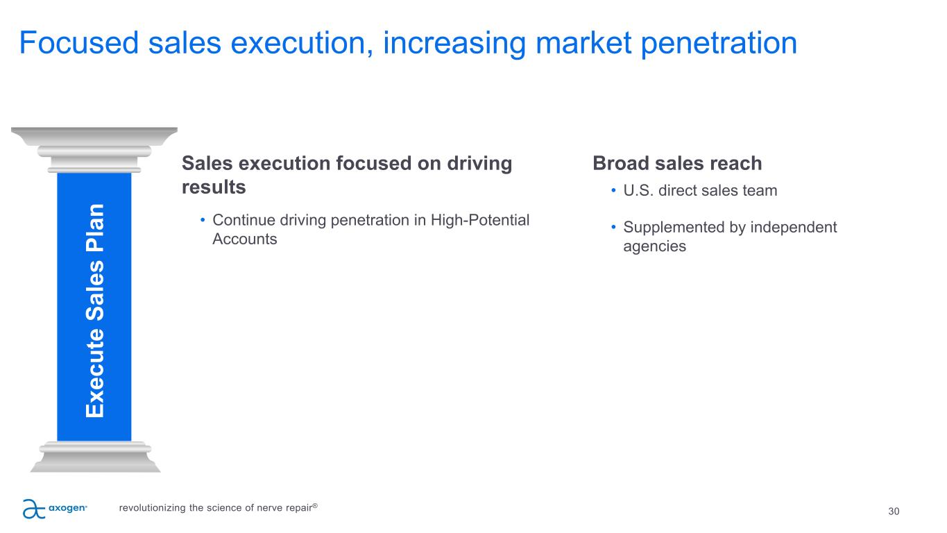 29 P IL L A R 2 Emphasis on education • In-person and virtual national education programs • Customized multimodal learning programs to specific surgeon groups for advanced learning • Ongoing interactive webinar series covering the principles of nerve repair • Emphasis on training hand and micro- surgery fellows Ed uc at e Su rg eo ns , D ev el op A dv oc at es revolutionizing the science of nerve repair®