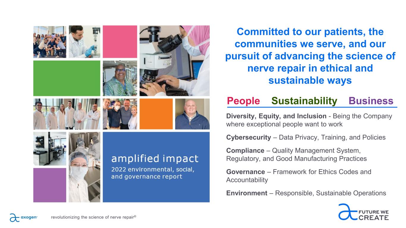 Committed to our patients, the communities we serve, and our pursuit of advancing the science of nerve repair in ethical and sustainable ways Diversity, Equity, and Inclusion - Being the Company where exceptional people want to work Cybersecurity – Data Privacy, Training, and Policies Compliance – Quality Management System, Regulatory, and Good Manufacturing Practices Governance – Framework for Ethics Codes and Accountability Environment – Responsible, Sustainable Operations People Sustainability Business revolutionizing the science of nerve repair®