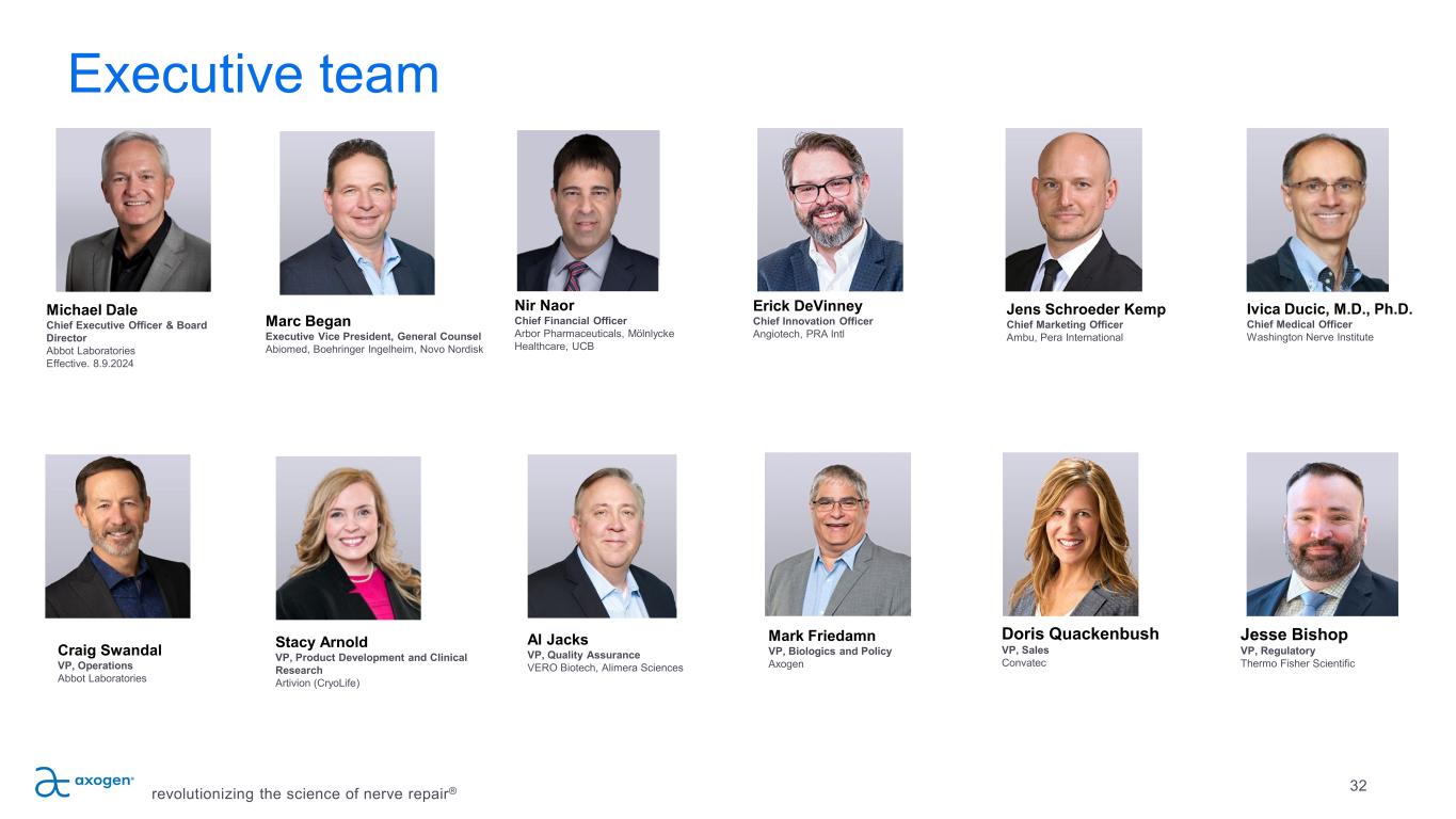 Executive team 32 Doris Quackenbush VP, Sales Convatec revolutionizing the science of nerve repair® Erick DeVinney Chief Innovation Officer Angiotech, PRA Intl Craig Swandal VP, Operations Abbot Laboratories Ivica Ducic, M.D., Ph.D. Chief Medical Officer Washington Nerve Institute Jens Schroeder Kemp Chief Marketing Officer Ambu, Pera International Marc Began Executive Vice President, General Counsel Abiomed, Boehringer Ingelheim, Novo Nordisk Michael Dale Chief Executive Officer & Board Director Abbot Laboratories Effective. 8.9.2024 Nir Naor Chief Financial Officer Arbor Pharmaceuticals, Mölnlycke Healthcare, UCB Stacy Arnold VP, Product Development and Clinical Research Artivion (CryoLife) Al Jacks VP, Quality Assurance VERO Biotech, Alimera Sciences Mark Friedamn VP, Biologics and Policy Axogen Jesse Bishop VP, Regulatory Thermo Fisher Scientific
