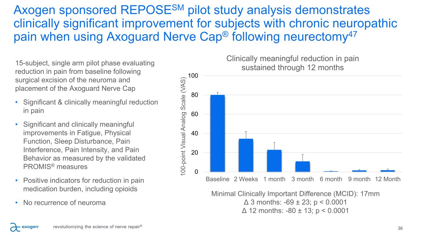Axogen sponsored REPOSESM pilot study analysis demonstrates clinically significant improvement for subjects with chronic neuropathic pain when using Axoguard Nerve Cap® following neurectomy47 36 15-subject, single arm pilot phase evaluating reduction in pain from baseline following surgical excision of the neuroma and placement of the Axoguard Nerve Cap • Significant & clinically meaningful reduction in pain • Significant and clinically meaningful improvements in Fatigue, Physical Function, Sleep Disturbance, Pain Interference, Pain Intensity, and Pain Behavior as measured by the validated PROMIS® measures • Positive indicators for reduction in pain medication burden, including opioids • No recurrence of neuroma 0 20 40 60 80 100 Baseline 2 Weeks 1 month 3 month 6 month 9 month 12 Month 10 0- po in t V is ua l A na lo g Sc al e (V AS ) Clinically meaningful reduction in pain sustained through 12 months Minimal Clinically Important Difference (MCID): 17mm Δ 3 months: -69 ± 23; p < 0.0001 Δ 12 months: -80 ± 13; p < 0.0001 revolutionizing the science of nerve repair®
