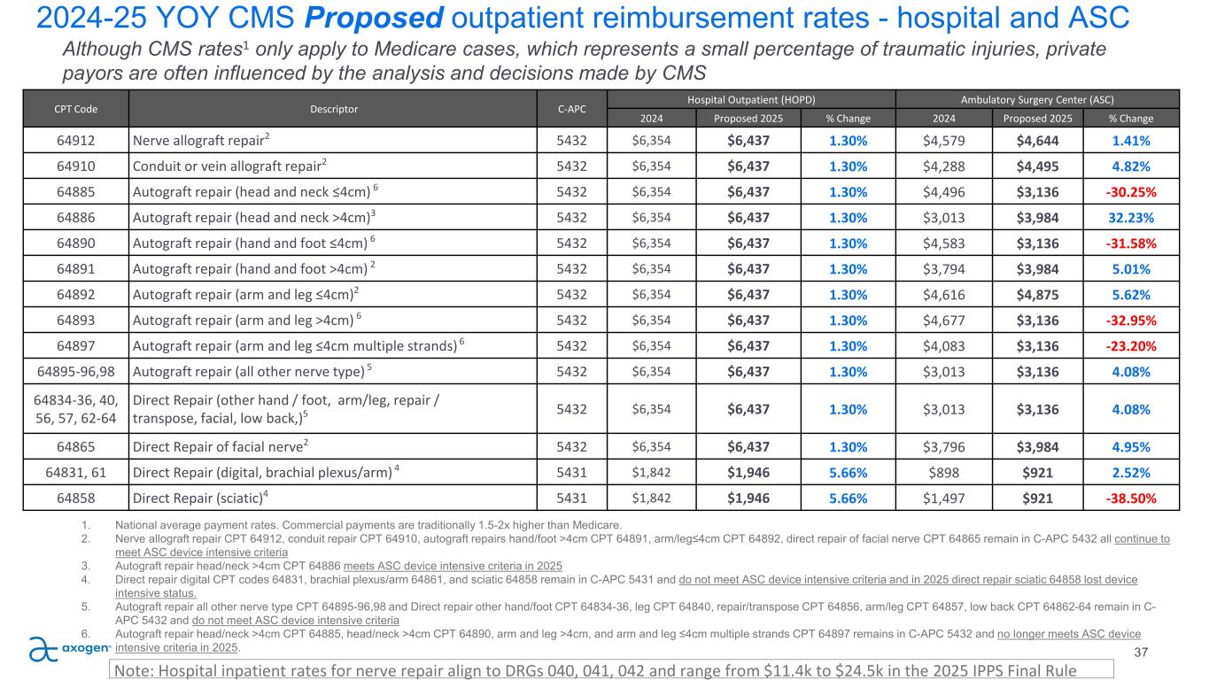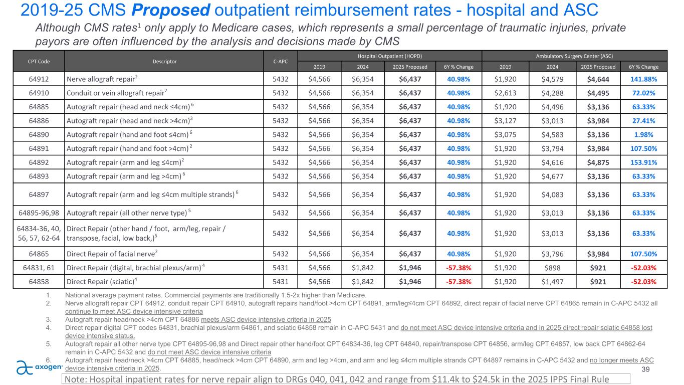 CPT Code Descriptor C-APC Hospital Outpatient (HOPD) Ambulatory Surgery Center (ASC) 2024 Proposed 2025 % Change 2024 Proposed 2025 % Change 64912 Nerve allograft repair2 5432 $6,354 $6,437 1.30% $4,579 $4,644 1.41% 64910 Conduit or vein allograft repair2 5432 $6,354 $6,437 1.30% $4,288 $4,495 4.82% 64885 Autograft repair (head and neck ≤4cm) 6 5432 $6,354 $6,437 1.30% $4,496 $3,136 -30.25% 64886 Autograft repair (head and neck >4cm)3 5432 $6,354 $6,437 1.30% $3,013 $3,984 32.23% 64890 Autograft repair (hand and foot ≤4cm) 6 5432 $6,354 $6,437 1.30% $4,583 $3,136 -31.58% 64891 Autograft repair (hand and foot >4cm) 2 5432 $6,354 $6,437 1.30% $3,794 $3,984 5.01% 64892 Autograft repair (arm and leg ≤4cm)2 5432 $6,354 $6,437 1.30% $4,616 $4,875 5.62% 64893 Autograft repair (arm and leg >4cm) 6 5432 $6,354 $6,437 1.30% $4,677 $3,136 -32.95% 64897 Autograft repair (arm and leg ≤4cm multiple strands) 6 5432 $6,354 $6,437 1.30% $4,083 $3,136 -23.20% 64895-96,98 Autograft repair (all other nerve type) 5 5432 $6,354 $6,437 1.30% $3,013 $3,136 4.08% 64834-36, 40, 56, 57, 62-64 Direct Repair (other hand / foot, arm/leg, repair / transpose, facial, low back,)5 5432 $6,354 $6,437 1.30% $3,013 $3,136 4.08% 64865 Direct Repair of facial nerve2 5432 $6,354 $6,437 1.30% $3,796 $3,984 4.95% 64831, 61 Direct Repair (digital, brachial plexus/arm) 4 5431 $1,842 $1,946 5.66% $898 $921 2.52% 64858 Direct Repair (sciatic)4 5431 $1,842 $1,946 5.66% $1,497 $921 -38.50% 2024-25 YOY CMS Proposed outpatient reimbursement rates - hospital and ASC 37 Although CMS rates1 only apply to Medicare cases, which represents a small percentage of traumatic injuries, private payors are often influenced by the analysis and decisions made by CMS 1. National average payment rates. Commercial payments are traditionally 1.5-2x higher than Medicare. 2. Nerve allograft repair CPT 64912, conduit repair CPT 64910, autograft repairs hand/foot >4cm CPT 64891, arm/leg≤4cm CPT 64892, direct repair of facial nerve CPT 64865 remain in C-APC 5432 all continue to meet ASC device intensive criteria 3. Autograft repair head/neck >4cm CPT 64886 meets ASC device intensive criteria in 2025 4. Direct repair digital CPT codes 64831, brachial plexus/arm 64861, and sciatic 64858 remain in C-APC 5431 and do not meet ASC device intensive criteria and in 2025 direct repair sciatic 64858 lost device intensive status. 5. Autograft repair all other nerve type CPT 64895-96,98 and Direct repair other hand/foot CPT 64834-36, leg CPT 64840, repair/transpose CPT 64856, arm/leg CPT 64857, low back CPT 64862-64 remain in C- APC 5432 and do not meet ASC device intensive criteria 6. Autograft repair head/neck >4cm CPT 64885, head/neck >4cm CPT 64890, arm and leg >4cm, and arm and leg ≤4cm multiple strands CPT 64897 remains in C-APC 5432 and no longer meets ASC device intensive criteria in 2025. Note: Hospital inpatient rates for nerve repair align to DRGs 040, 041, 042 and range from $11.4k to $24.5k in the 2025 IPPS Final Rule
