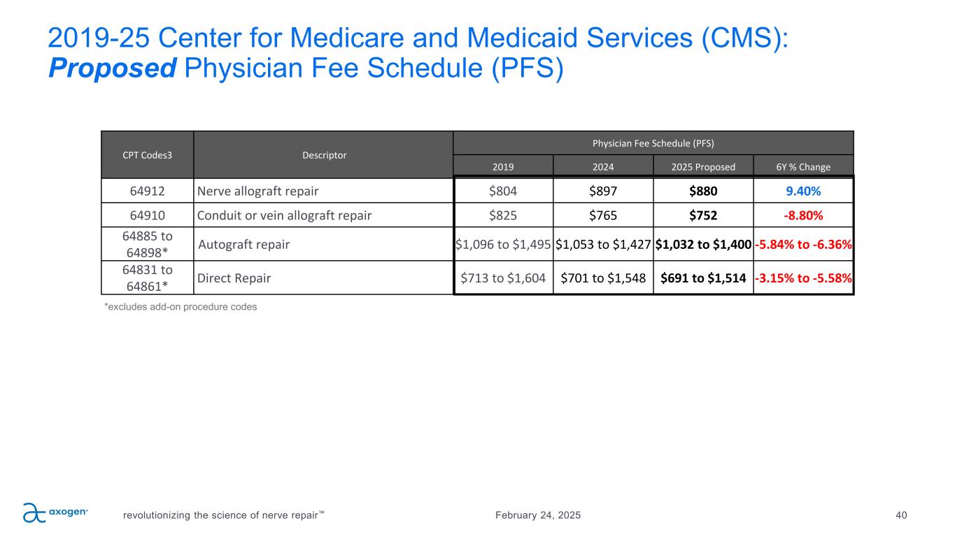 2024-25 YoY Center for Medicare and Medicaid Services (CMS): Proposed Physician Fee Schedule (PFS) revolutionizing the science of nerve repair 38February 24, 2025 CPT Codes to f Descriptor Physician Fee Schedule (PFS) 2024 2025 Proposed % Change 64912 Nerve allograft repair $897 $880 -1.95% 64910 Conduit or vein allograft repair $765 $752 -1.65% 64885 to 64898* Autograft repair $1,053 to $1,427 $1,032 to $1,400 -1.9% to -2.00% 64831 to 64865* Direct Repair $701 to $1,548 $691 to $1,514 -1.49% to -2.17% *excludes add-on procedure codes