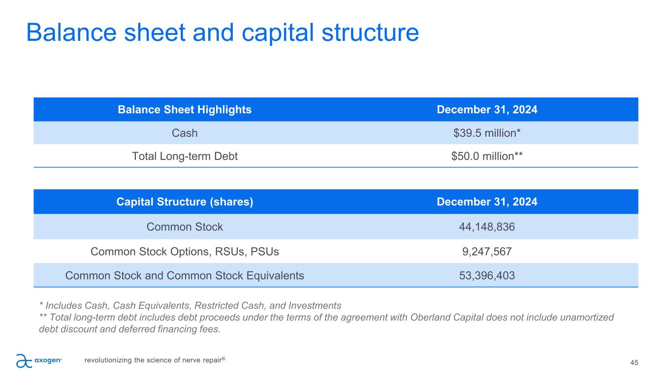 45 Balance Sheet Highlights December 31, 2024 Cash $39.5 million* Total Long-term Debt $50.0 million** Capital Structure (shares) December 31, 2024 Common Stock 44,148,836 Common Stock Options, RSUs, PSUs 9,247,567 Common Stock and Common Stock Equivalents 53,396,403 Balance sheet and capital structure * Includes Cash, Cash Equivalents, Restricted Cash, and Investments ** Total long-term debt includes debt proceeds under the terms of the agreement with Oberland Capital does not include unamortized debt discount and deferred financing fees. revolutionizing the science of nerve repair®
