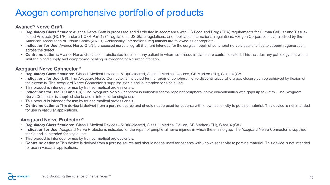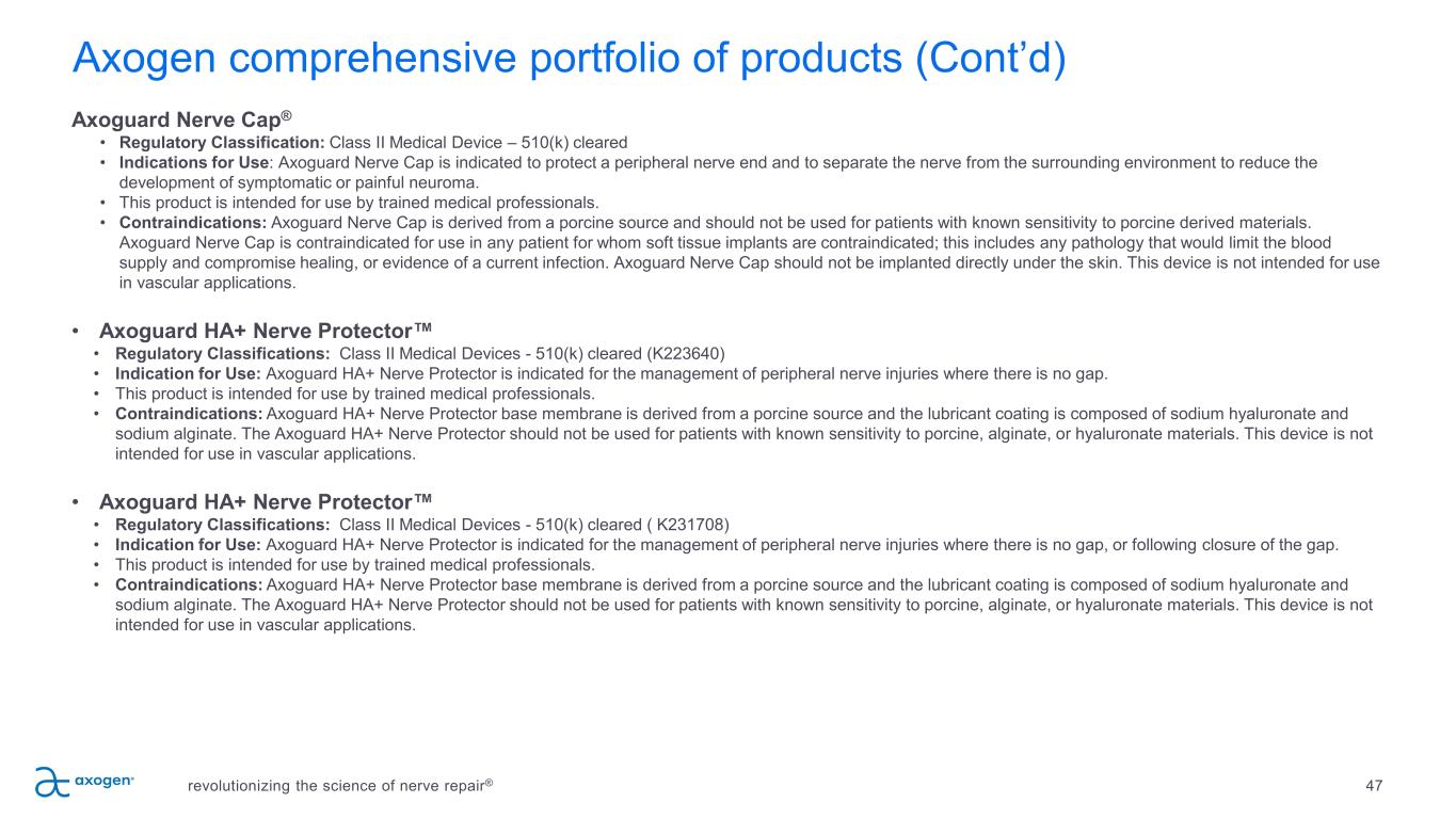 Axogen comprehensive portfolio of products Avance® Nerve Graft • Regulatory Classification: Avance Nerve Graft is processed and distributed in accordance with US Food and Drug (FDA) requirements for Human Cellular and Tissue- based Products (HCT/P) under 21 CFR Part 1271 regulations, US State regulations, and applicable international regulations. Axogen Corporation is accredited by the American Association of Tissue Banks (AATB). Additionally, international regulations are followed as appropriate. • Indication for Use: Avance Nerve Graft is processed nerve allograft (human) intended for the surgical repair of peripheral nerve discontinuities to support regeneration across the defect. • Contraindications: Avance Nerve Graft is contraindicated for use in any patient in whom soft tissue implants are contraindicated. This includes any pathology that would limit the blood supply and compromise healing or evidence of a current infection. Axoguard Nerve Connector ® • Regulatory Classifications: Class II Medical Devices - 510(k) cleared, Class III Medical Devices, CE Marked (EU), Class 4 (CA) • Indications for Use (US): The Axoguard Nerve Connector is indicated for the repair of peripheral nerve discontinuities where gap closure can be achieved by flexion of the extremity. The Axoguard Nerve Connector is supplied sterile and is intended for single use. • This product is intended for use by trained medical professionals. • Indications for Use (EU and UK): The Axoguard Nerve Connector is indicated for the repair of peripheral nerve discontinuities with gaps up to 5 mm. The Axoguard Nerve Connector is supplied sterile and is intended for single use. • This product is intended for use by trained medical professionals. • Contraindications: This device is derived from a porcine source and should not be used for patients with known sensitivity to porcine material. This device is not intended for use in vascular applications. Axoguard Nerve Protector ® • Regulatory Classifications: Class II Medical Devices - 510(k) cleared, Class III Medical Device, CE Marked (EU), Class 4 (CA) • Indication for Use: Axoguard Nerve Protector is indicated for the repair of peripheral nerve injuries in which there is no gap. The Axoguard Nerve Connector is supplied sterile and is intended for single use. • This product is intended for use by trained medical professionals. • Contraindications: This device is derived from a porcine source and should not be used for patients with known sensitivity to porcine material. This device is not intended for use in vascular applications. 46revolutionizing the science of nerve repair®