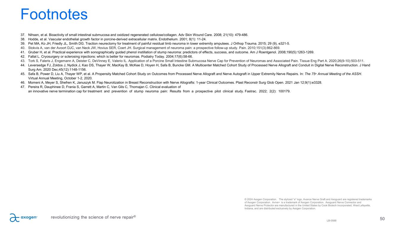 50 Footnotes 37. Nihsen, et al. Bioactivity of small intestinal submucosa and oxidized regenerated cellulose/collagen. Adv Skin Wound Care. 2008; 21(10): 479-486. 38. Hodde, et al. Vascular endothelial growth factor in porcine-derived extracellular matrix. Endothelium. 2001; 8(1): 11-24. 39. Pet MA, Ko JH, Friedly JL, Smith DG. Traction neurectomy for treatment of painful residual limb neuroma in lower extremity amputees. J Orthop Trauma. 2015; 29 (9), e321-5. 40. Stokvis A, van der Avoort DJC, van Neck JW, Hovius SER, Coert JH. Surgical management of neuroma pain: a prospective follow-up study. Pain. 2010;151(3):862-869. 41. Gruber H, et al. Practical experience with sonographically guided phenol instillation of stump neuroma: predictors of effects, success, and outcome. Am J Roentgenol. 2008;190(5):1263-1269. 42. Fallat L. Cryosurgery or sclerosing injections: which is better for neuromas. Podiatry Today. 2004;17(6):58-66. 43. Tork S, Faleris J, Engemann A, Deister C, DeVinney E, Valerio IL. Application of a Porcine Small Intestine Submucosa Nerve Cap for Prevention of Neuromas and Associated Pain. Tissue Eng Part A. 2020;26(9-10):503-511. 44. Leversedge FJ, Zoldos J, Nydick J, Kao DS, Thayer W, MacKay B, McKee D, Hoyen H, Safa B, Buncke GM. A Multicenter Matched Cohort Study of Processed Nerve Allograft and Conduit in Digital Nerve Reconstruction. J Hand Surg Am. 2020 Dec;45(12):1148-1156. 45. Safa B, Power D, Liu A, Thayer WP, et al. A Propensity Matched Cohort Study on Outcomes from Processed Nerve Allograft and Nerve Autograft in Upper Extremity Nerve Repairs. In: The 75th Annual Meeting of the ASSH. Virtual Annual Meeting, October 1-2, 2020. 46. Momeni A, Meyer S, Shefren K, Januszyk M. Flap Neurotization in Breast Reconstruction with Nerve Allografts: 1-year Clinical Outcomes. Plast Reconstr Surg Glob Open. 2021 Jan 12;9(1):e3328. 47. Pereira R, Dauphinee D, Frania S, Garrett A, Martin C, Van Gils C, Thomajan C. Clinical evaluation of an innovative nerve termination cap for treatment and prevention of stump neuroma pain: Results from a prospective pilot clinical study. Fastrac. 2022; 2(2): 100179. © 2024 Axogen Corporation. The stylized “a” logo, Avance Nerve Graft and Axoguard are registered trademarks of Axogen Corporation. Avive+ is a trademark of Axogen Corporation. Axoguard Nerve Connector and Axoguard Nerve Protector are manufactured in the United States by Cook Biotech Incorporated, West Lafayette, Indiana, and are distributed exclusively by Axogen Corporation. LB-0588 revolutionizing the science of nerve repair®