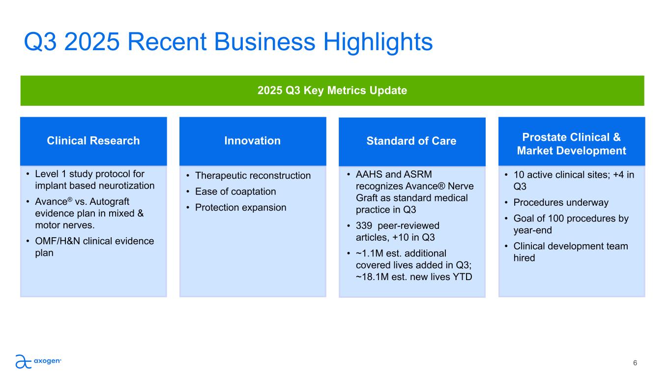 5 Growth • Q3 revenue increased to $60.1M, growing 23.5% YoY • Q3 reflected broad-based growth across the entire portfolio • Double-digit growth performance in all markets High Potential Accounts • YTD, HiPo accounts yielded approx. 64% of YoY revenue growth (vs 2025 66% goal) • YTD, HiPo accounts have yielded 19% YoY increase in average account productivity (vs 2025 21% goal) • 668 Active HiPo accounts in the first three quarters of 2025; an increase of 1.2% YoY Professional Education • Breast: ended Q3 with 22 specialists and 2 regional sales directors ("RSD") • Extremities: ended Q3 with 110 reps and 15 RSDs • OMF/H&N: ended Q3 with 4 market development managers Commercial Infrastructure • Breast: 62 surgeon pairs trained YTD (vs. 2025 75 target); 121 active programs in Q3 (+7% YoY); 281 procedures in Q3 (+20% YoY) • Extremities: 97 surgeons trained YTD; target 105 by YE • OMF/H&N: 57 surgeons trained YTD; exceeding target 45 by YE 2025 Q3 Key Metrics Update Q3 2025 Recent Business Highlights
